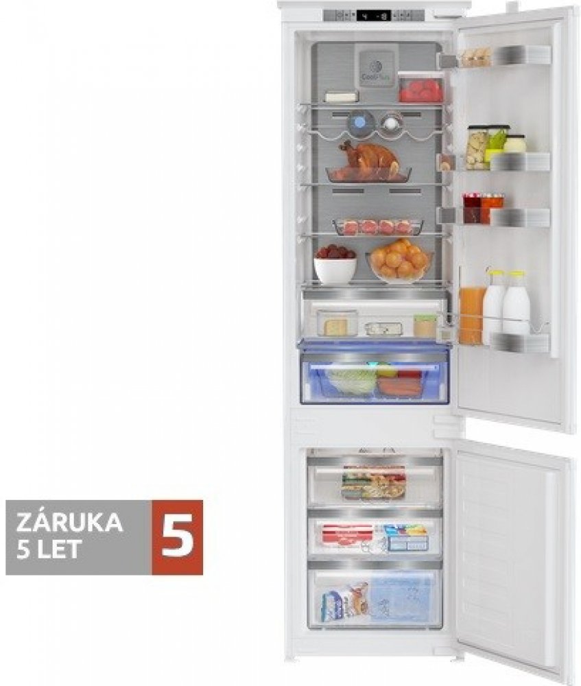 Vestavná kombinovaná chladnička NO FROST; DUO-COOLING; en. třída E; celkový hrubý objem 306 l; elektronická regulace teploty s LED displejem; možnost změny směru otevírání dveří; kluzné panty pro vestavbu; nízkoteplotní zóna SuperFresh; zásuvka na ovoce a zeleninu VitaminZone se třemi typy světla pro dosažení delší čerstvosti potravin; antibakteriální těsnění; akustická signalizace otevřených dveř...