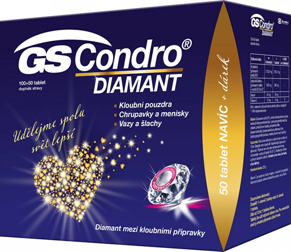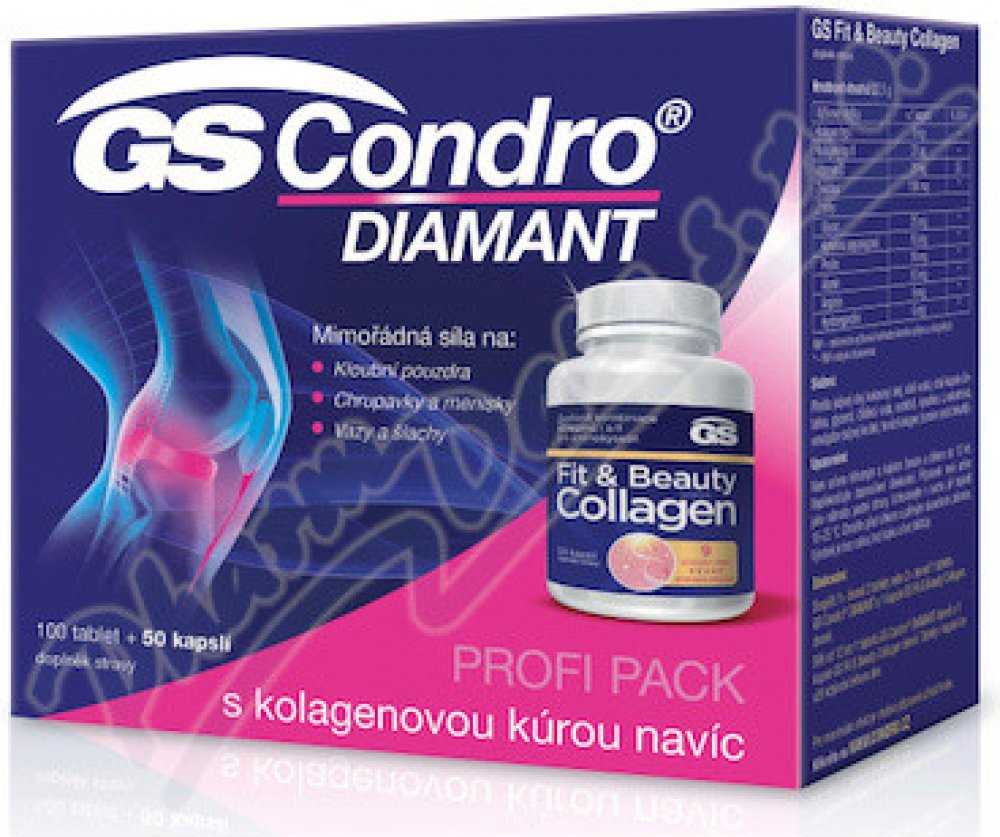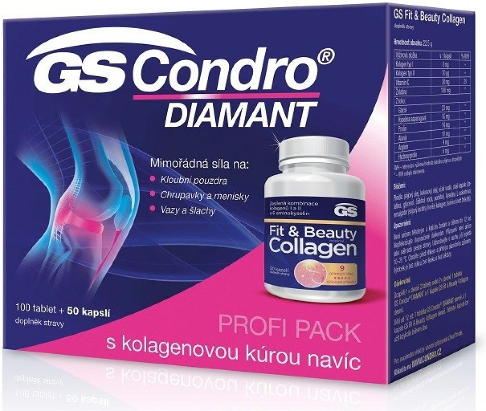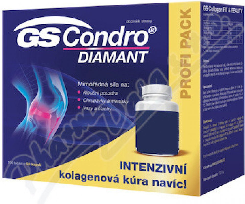 GS Condro Diamant Profi Pack je doplněk stravy. GS Condro Diamant je extrémně silný kloubní doplněk stravy, který pečuje nejen o kloubní chrupavky, ale také o okolí kloubu, tedy kloubní pouzdra, vazy a šlachy. Extra silná dávka glukosamin sulfátu je obohacena o revoluční komplex Diamant Fortescin. Kromě toho přípravek obsahuje vitamin C. Maximální síla a účinnost GS Condro, doplněná o kolagenovou ...
