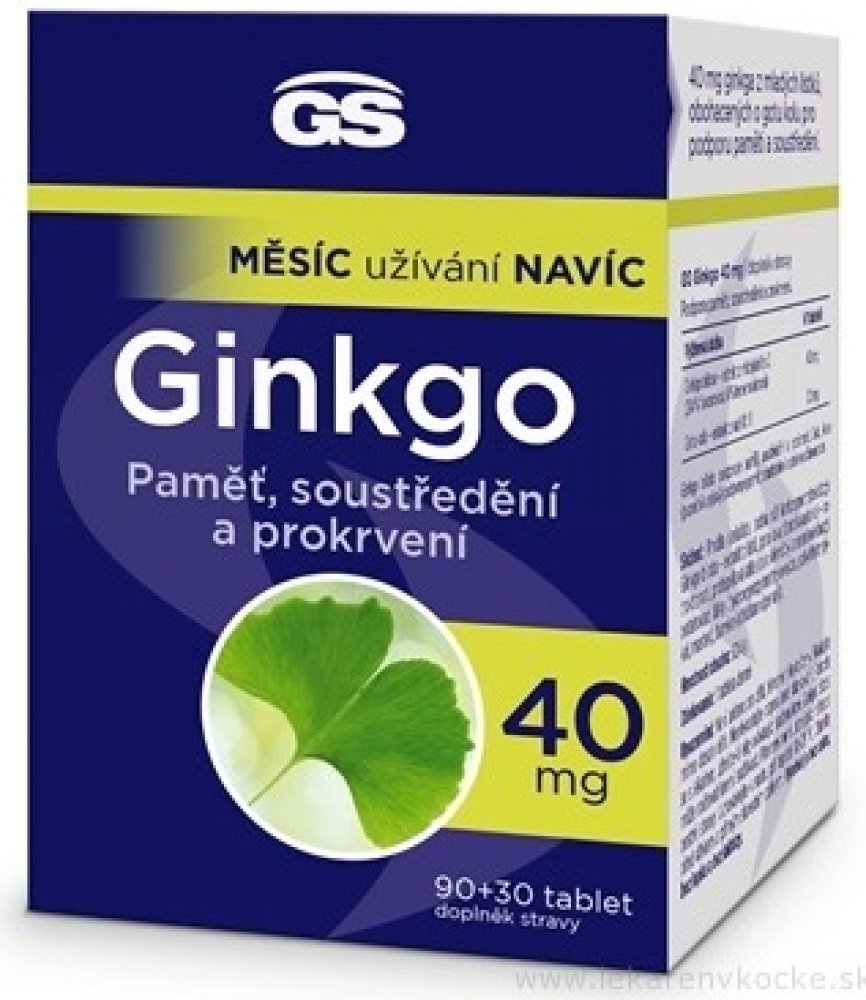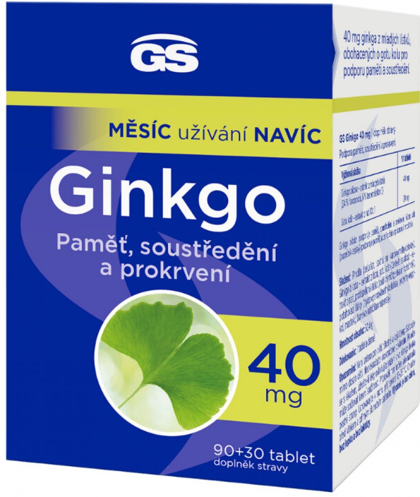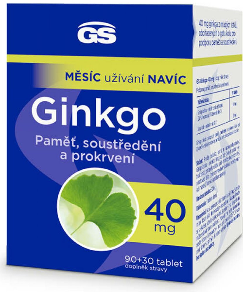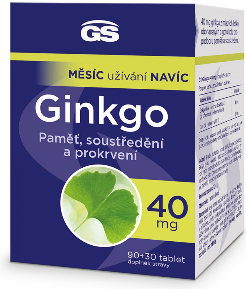 Prémiový přípravek s obsahem extraktu z mladých lístků ginkga, obohaceného o gotu kolu pro podporu paměti a soustředění. GS Ginkgo 40 mg obsahuje 40 mg standardizovaného extraktu z mladých lístků ginkga, který se získává speciální technologií, čímž je zaručeno vysoké množství nejdůležitějších účinných látek v každé tabletě. Výhodné balení s měsícem užívání navíc.