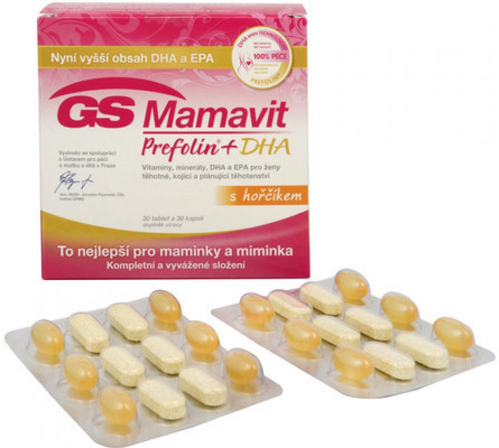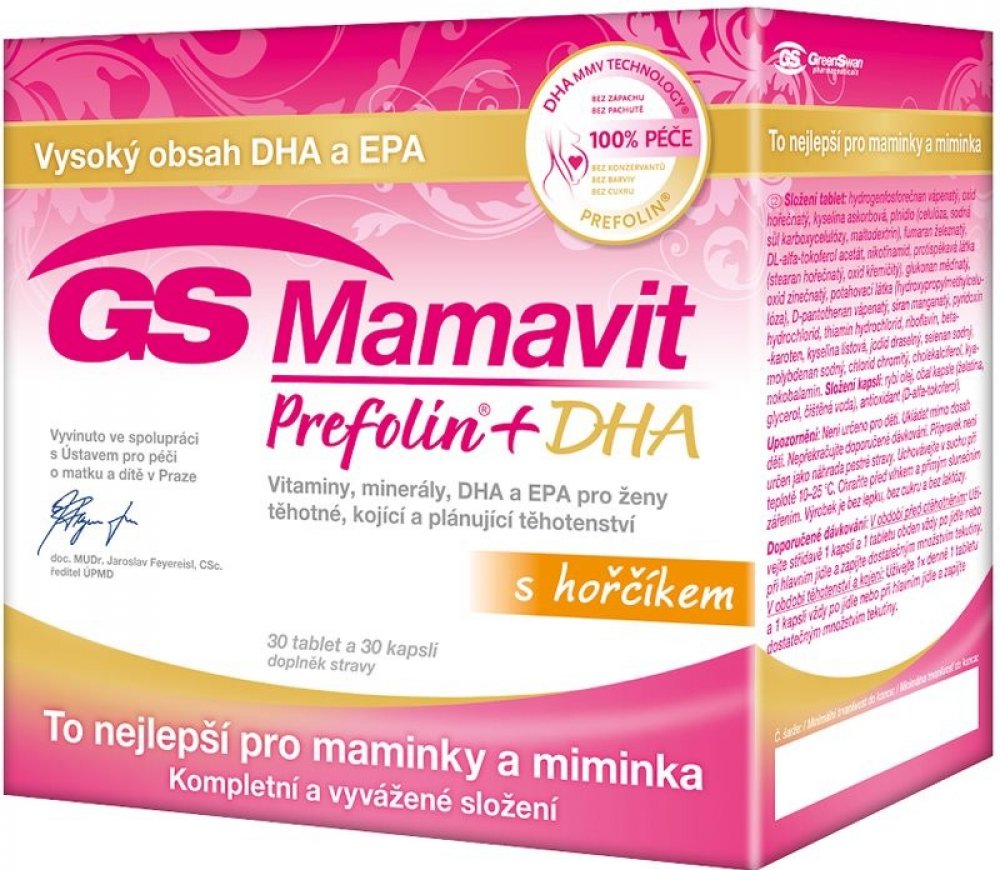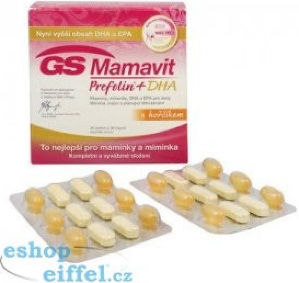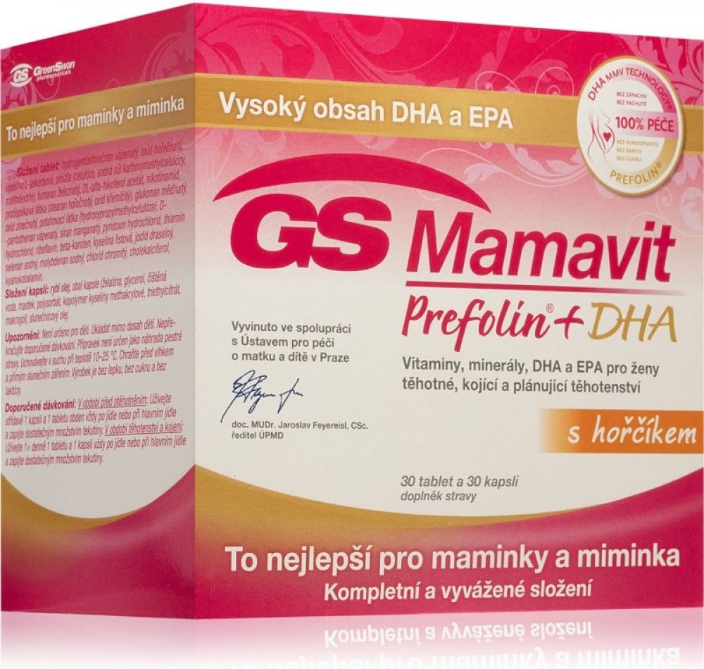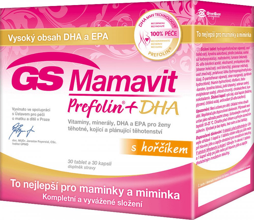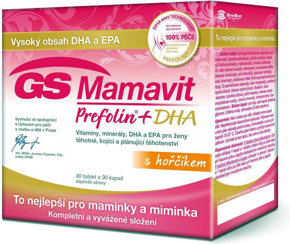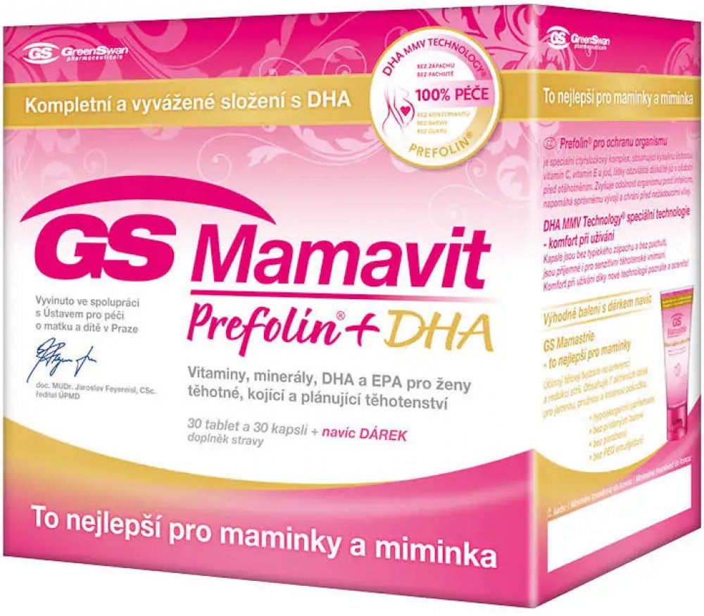 GS Mamavit Prefolin® + DHA, který byl vyvinut přímo na míru maminkám a zaručuje jejich organismu kompletní a vyvážené dodání všech potřebných složek.