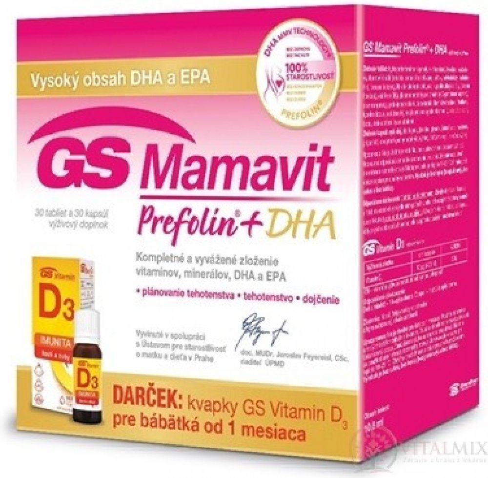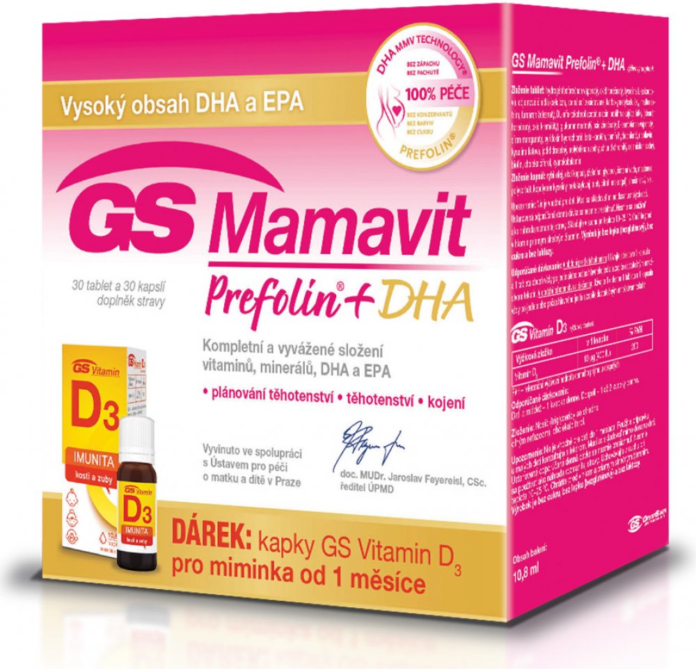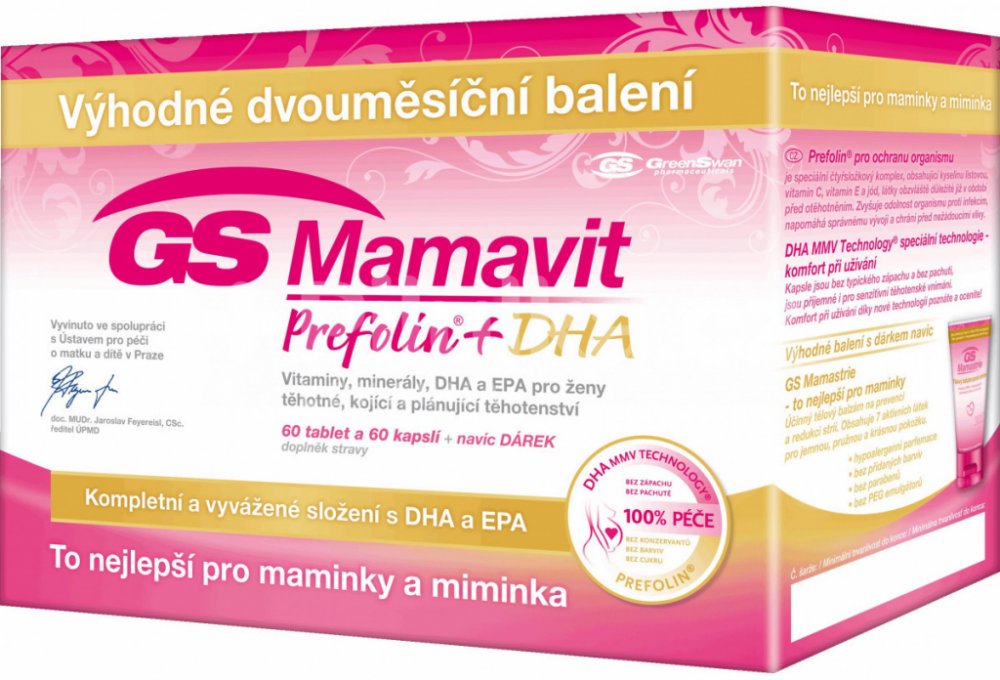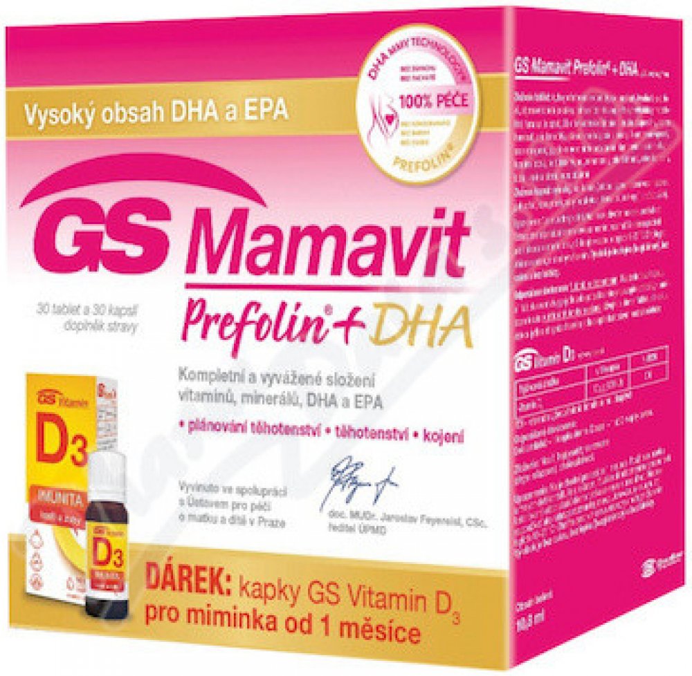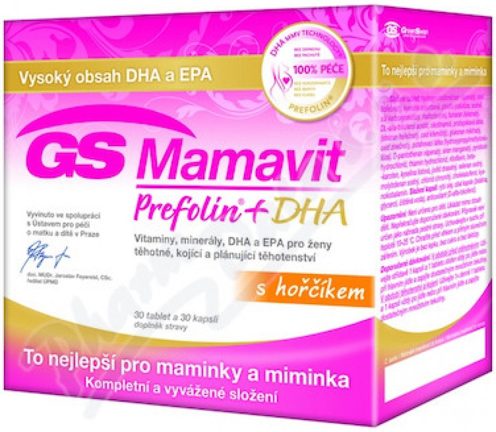 GS Mamavit Prefolin® + DHA je kompletní a vyvážená kombinace vitaminu, minerálu, DHA a EPA. Je to kombinace, která byla navržena tak, aby vyhovovala maminkám a jejich miminkům ve všech důležitých obdobích: • v období plánování mateřství – před otěhotněním, pro podporu imunity a srovnání organismu před velmi náročným obdobím pro každou ženu, • v období těhotenství, kdy výrazně narůstá potřeba vitaminu a minerálu, • i v období po porodu při kojení, kdy se organismus postupně zotavuje a dostává do normálního stavu.