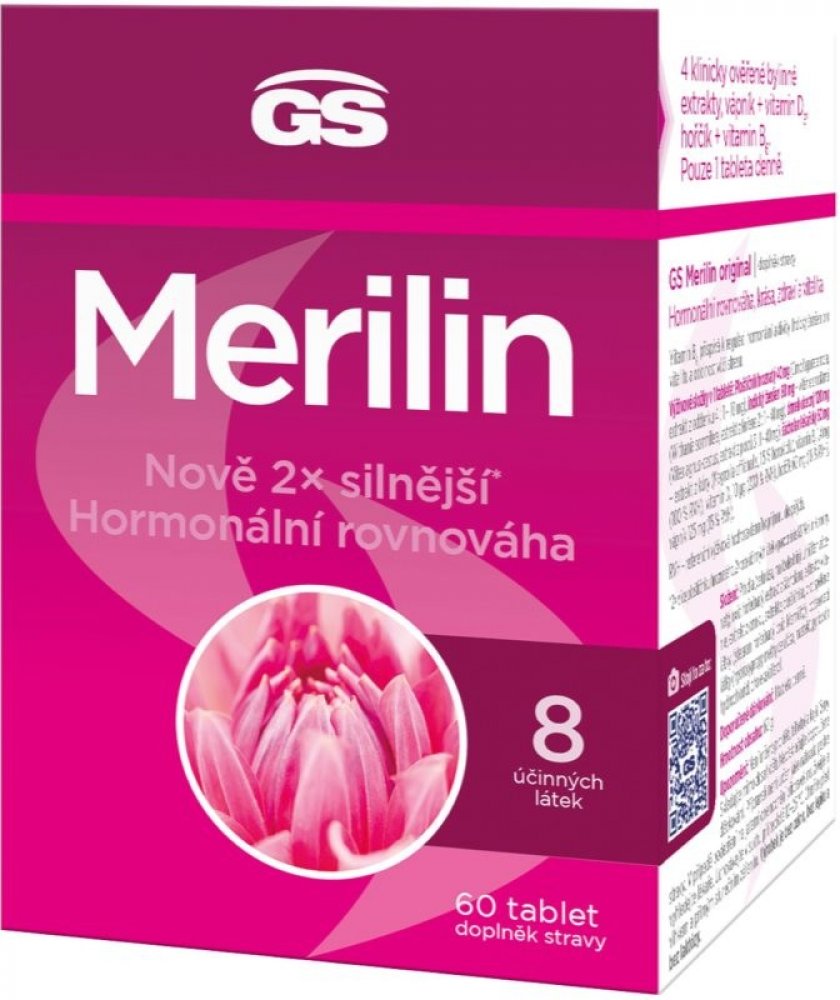 GS Merilin Original je přírodní, vysoce účinný, nehormonální přípravek, jehož složení bylo vyvinuto na základě poznatků z nejnovějších klinických studií. Obsahuje unikátní kombinaci 2× většího množství cimicifugy racemosy (ploštičníku hroznatého) s klinicky ověřenou dávkou magnolie officinalis (šácholanu lékařského), vitexu agnus castus (drmku obecného) a dalších látek, které pomáhají k udržení správné hladiny hormonů v těle a efektivně přispívají ke snížení projevů menopauzy. Účinné složky rovněž podporují fyzickou i psychickou pohodu a vitalitu.