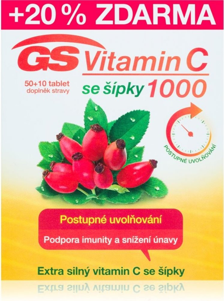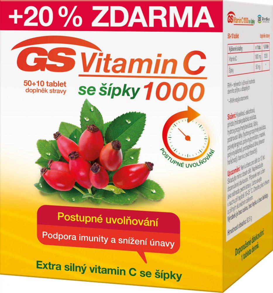 Složení: Kyselina L-askorbová, plnidla (mikrokrystalická celulóza, hydroxypropylmetylcelulóza), šípky, potahovací látky (hydroxypropylmetylcelulóza, polyetylenglykol, polyvinylpyrrolidon, mastek, polyvinylalkohol), protispékavá látka (stearan hořečnatý), barvivo (oxid titaničitý).