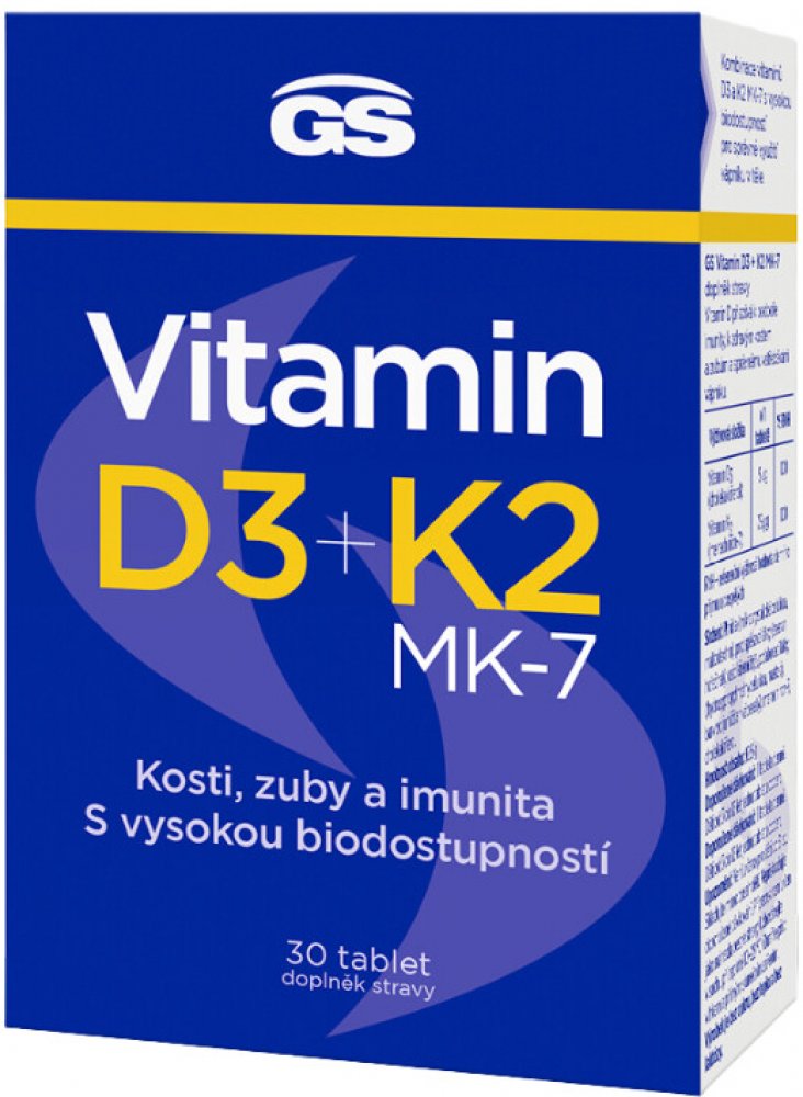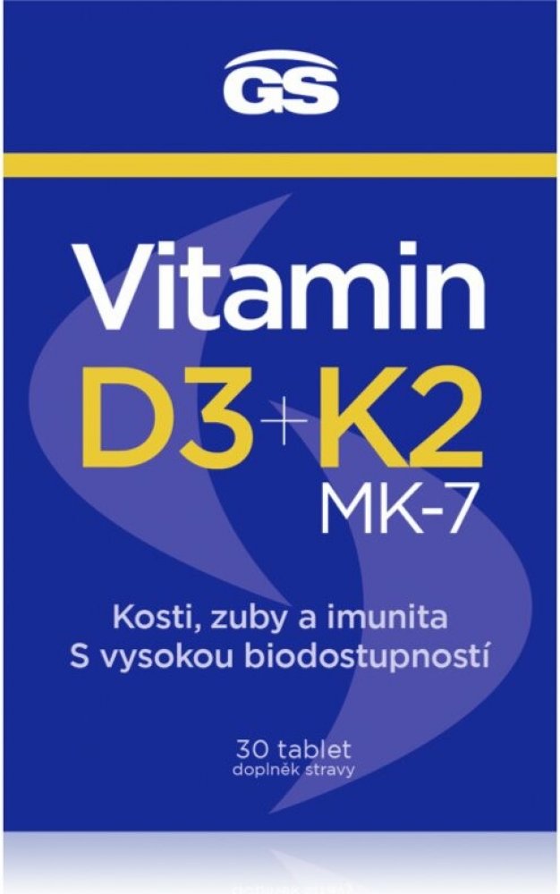 GS Vitamin D3+K2 je doplněk stravy kombinující vitaminy D3 a K2 pro podporu zdravých kostí. Vitamin D3 přispívá k normální činnosti svalů a vstřebávání vápníku a fosforu.