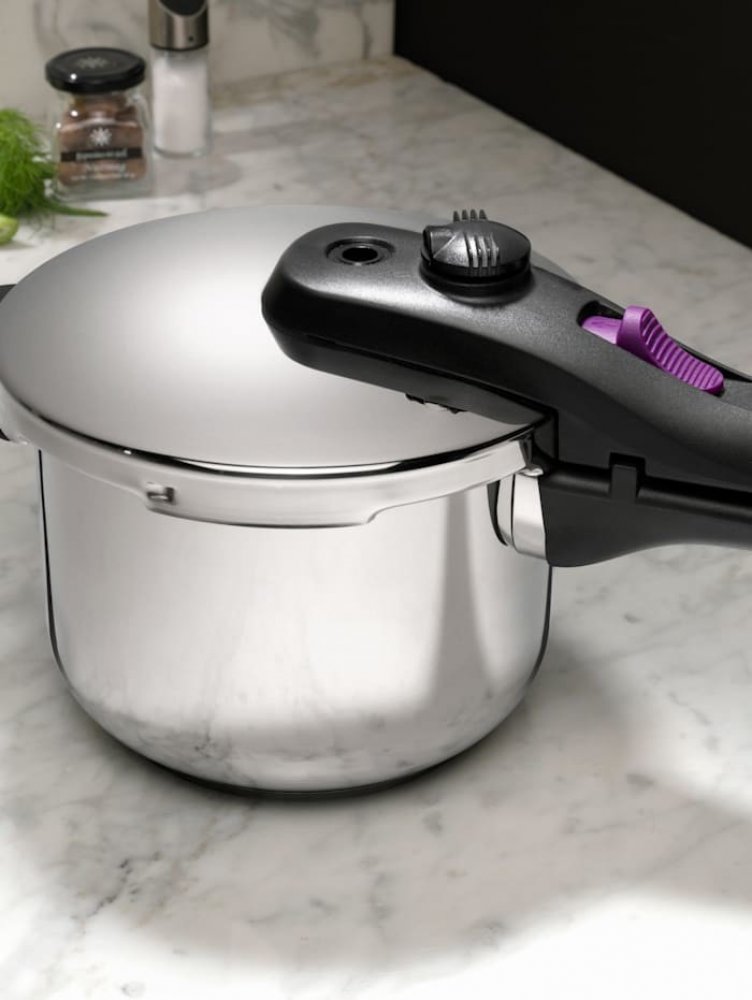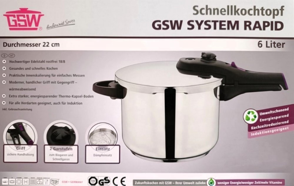 GSW Tlakový hrnec Rapid, 22 cm Tlakový hrnec z kvalitní nerezové oceli 18/8 s praktickou vnitřní stupnicí v litrech Ideální pro zdravé a rychlé vaření Snadná manipulace 3stupňový bezpečnostní systém 2 úrovně vaření Vložka určená na dušení a napařování pokrmů Bezpečnostní držadlo a protilehlé držadlo pro bezpečné uchopení Extra silné a energeticky úsporné termo dno Vhodný pro všechny druhy varných ...