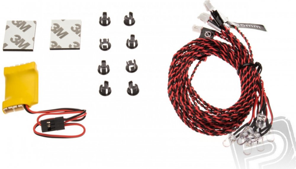 Sada LED osvětlení se skládá z řídící jednotky a osmi 5 mm LED s vysokou svítivostí na 600 mm kabelu: 2x trvale svítící bílá (přistávací světla), 1x trvale svítící zelená (pravé poziční světlo), 1x trvale svítící červená (levé poziční světlo), 2x pomalu blikající červená (červený výstražný maják pro SOP/příď), 2x záblesková bílá (antikolizní maják). Sadu můžete použít i pro malé modely lodí, kde využijete levé červené a pravé zelené poziční světlo a trvale svítící bílá světla na stěžeň.