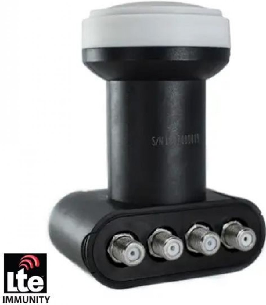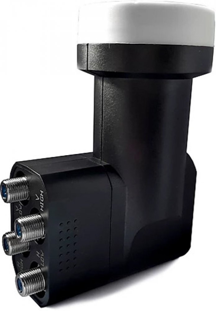 Kvalitní satelitní konvertor LNB quattro, určený pro satelitní multipřepínače. Konvertor má výborné technické parametry s velmi nízkým šumovým číslem a potlačuje nežadoucí rušení způsobené mobilními LTE sítěmi. Vysouvací plastový kryt na spodní straně poskytuje vysokou ochranu F konektorů před povětrnostními vlivy.