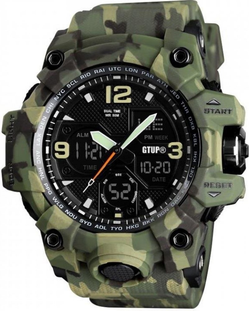 Gtup Pánské sportovní hodinky Shock GT-1050CAMO jsou originální pánské hodinky, které určitě zaujmou moderním a kvalitním zpracováním. Takzvané Quartz řešení strojku dává jistotu co nejdelší výdrže na baterii a zároveň veliké přesnosti. Řemínek tvoří polyuretan, pomáhá náramku zaujmout na první pohled bez jakékoli ztráty komfortu při nošení. Náramkové hodinky GTUP můžete nechat na ruce ve sprše ne...