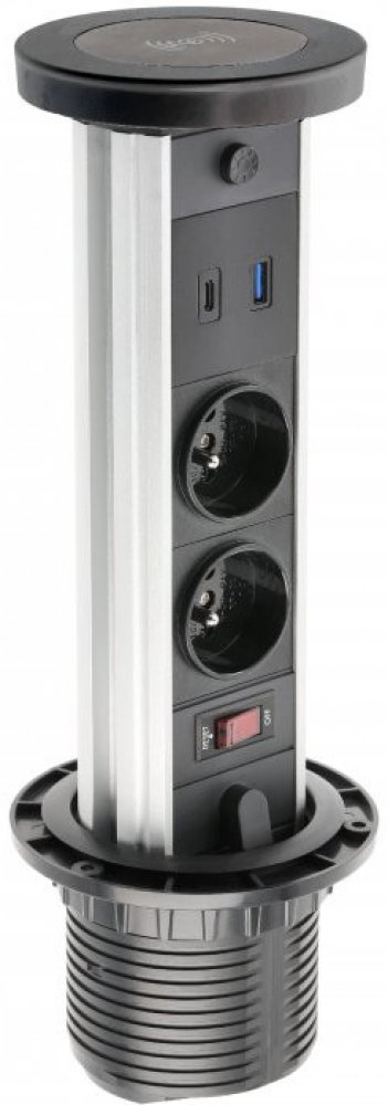 Stolní prodlužovací kabel, který se díky svému estetickému vzhledu a vysoké kvalitě zpracování hodí do všech typů místností. Může být používán v domácnostech až po konferenční místnosti. Jeho tvar a vertikální výsuv zaručují maximální využití volného prostoru, díky čemuž se osvědčí i v menších projektech. Navíc je vybaven indukčním nabíjením 5W a USB konektorem