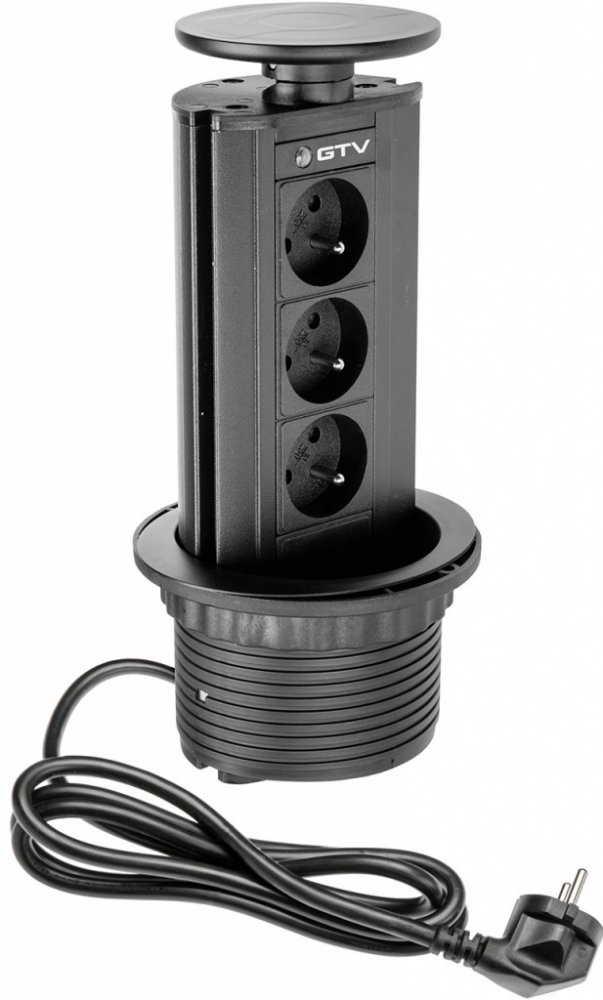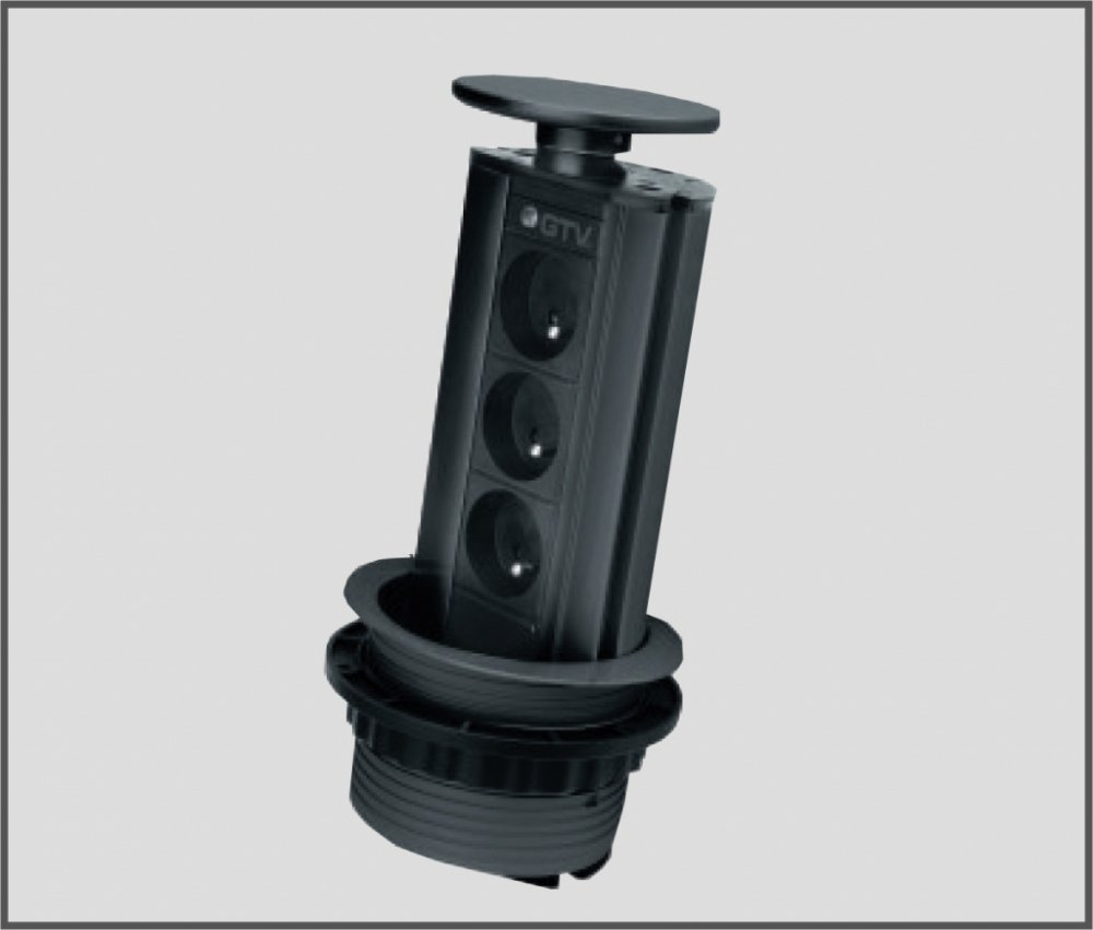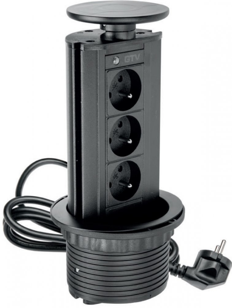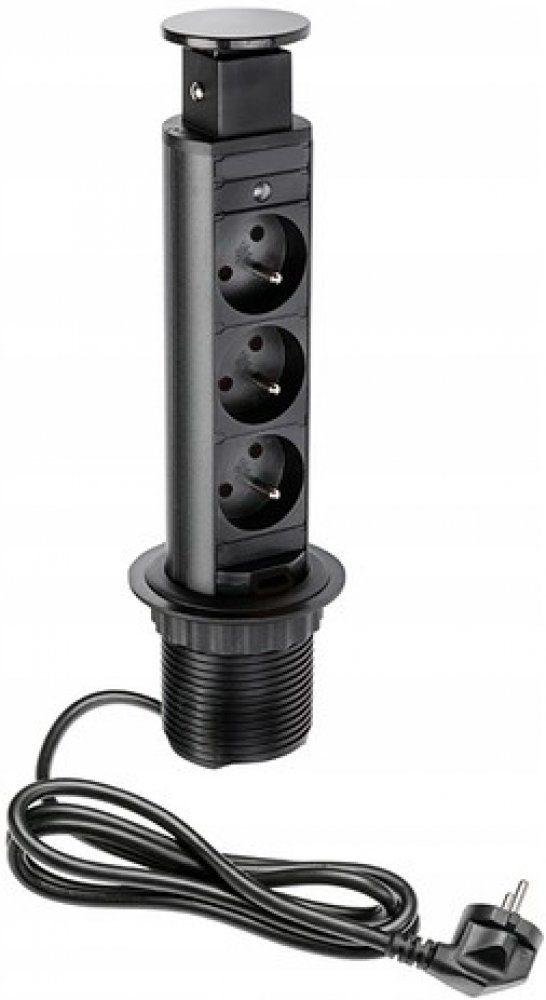 Černý výsuvný set 3 vestavných zásuvek, který diskrétně zapadne do pracovní desky v kuchyni nebo kanceláři. Posouvá se svisle dle potřeby, má robustní konstrukci z hliníku a plastu a dokonalé těsnění. Možnost napájení všech kuchyňských nebo elektrických zařízení, která používají klasickou elektrickou zásuvku. Vyžaduje vrtání otvoru do desky děrovací pilou o průměru 100 mm. Součástí produktu je pří...