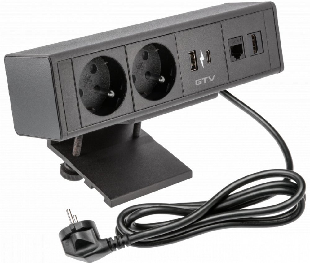 Nábytková elektrická zásuvkas držákem, který umožňuje snadnou a diskrétní montáž bez nutnosti vrtat/frézovat otvory v pracovní desce. 2x zásuvka s uzemněním, 1x HDMI, 1x RJ45, 1x USB - A a 1x USB - C.