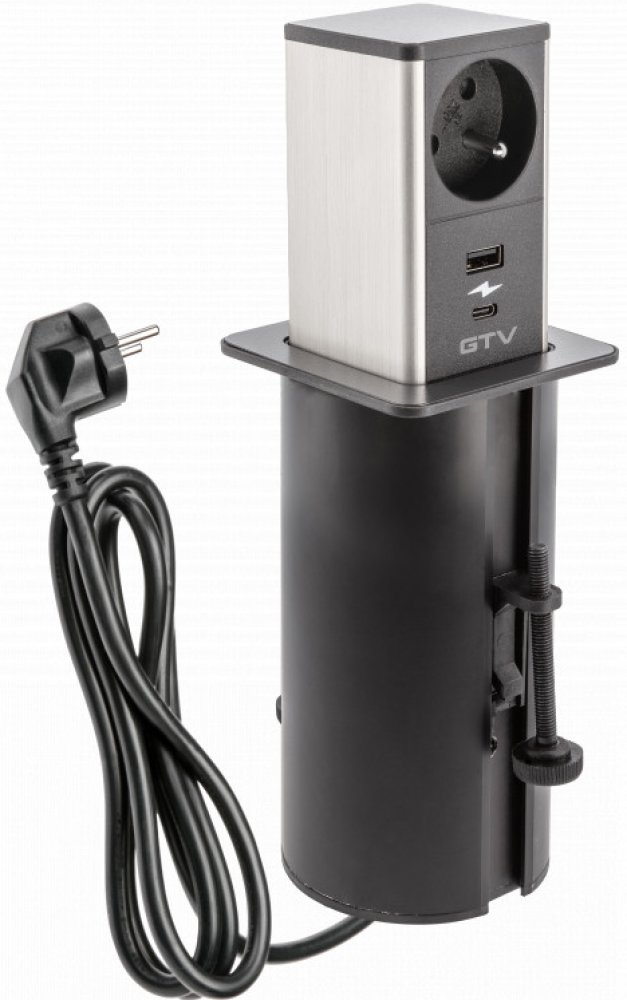 Výsuvná nábytková elektrická zásuvka v moderním stylu. 1X zásuvka s uzemněním, 1x USB-C 1x USB-A a 1,5 kabel.