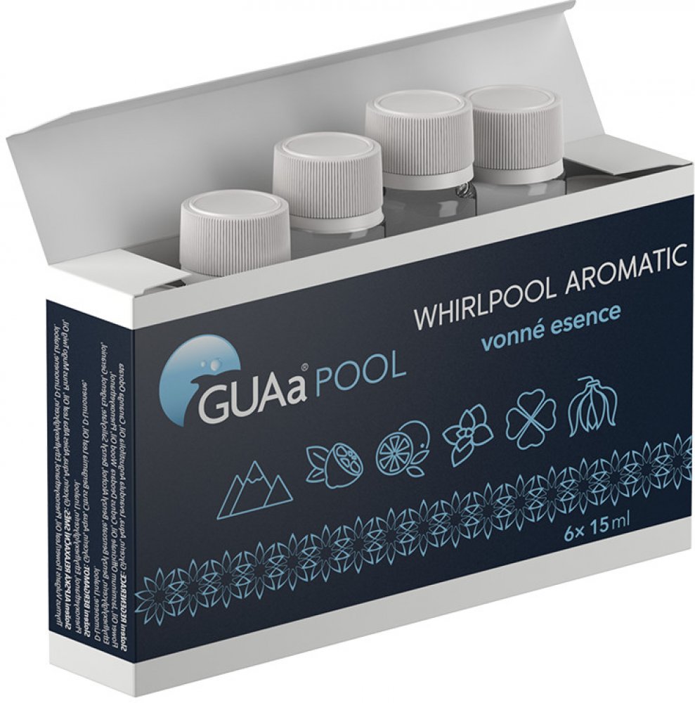 Vonné esence WHIRLPOOL AROMATIC byly vyvinuty s ohledem na používání bezchlórové dezinfekce GUAa POOL ve vířivých vanách. Nemají vliv na kvalitu vody, neobsahují alkohol a ani jiné látky, které mohou mít vliv na komfort uživatelů vířivých van. Složení bylo speciálně vyvinuto s předními odborníky a je unikátní na trhu s vonnými esencemi.