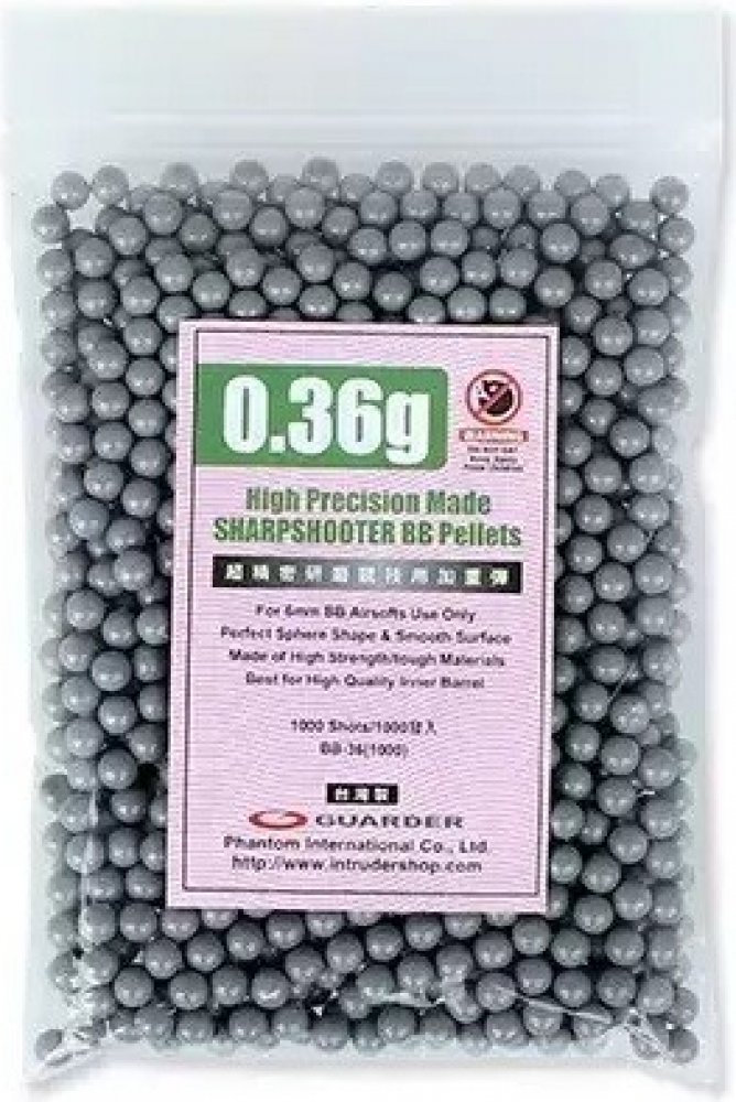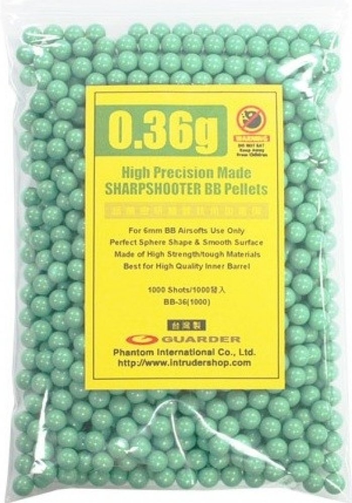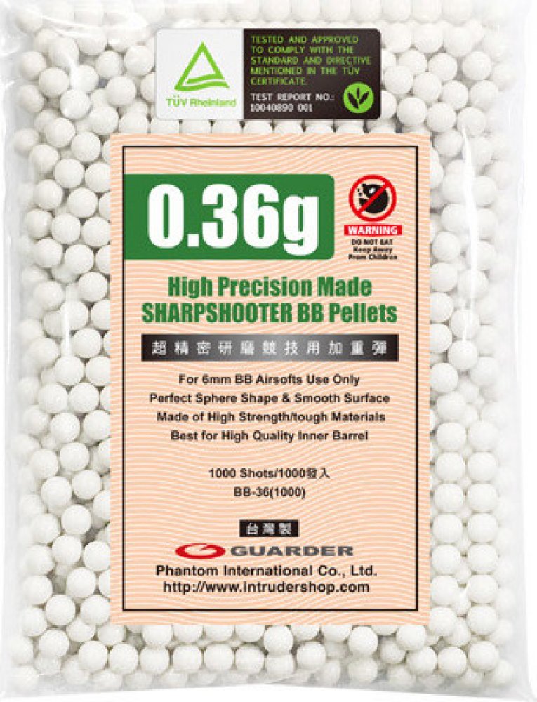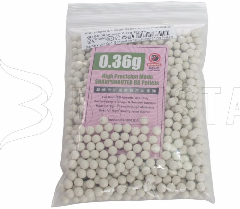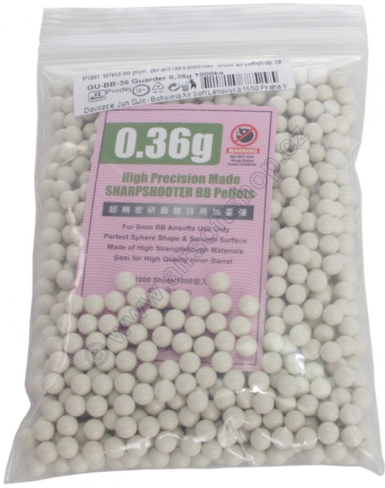 Kuličky Guarder 0,36g jsou velmi kvalitní kuličky vyrobené na Taiwanu. Díky velmi přesné toleranci jsou vhodné pro všechny typy zbraní, včetně zbraní s těsnými hlavněmi.