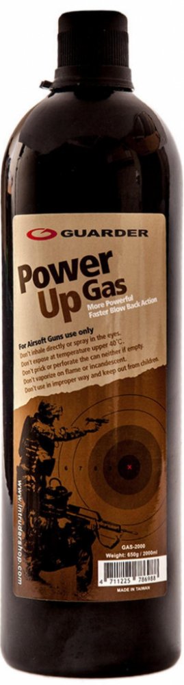 Velmi silný hnací plyn Power up 2000 o objemu 2 litry. Též označovaný jako Red Gas. Tlak při teplotě 24°C: 16 kg / cm2. Plyn pro celokovové zbraně.Parametry: