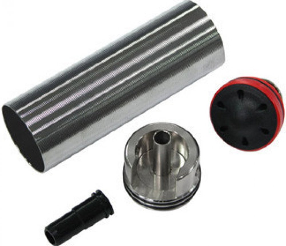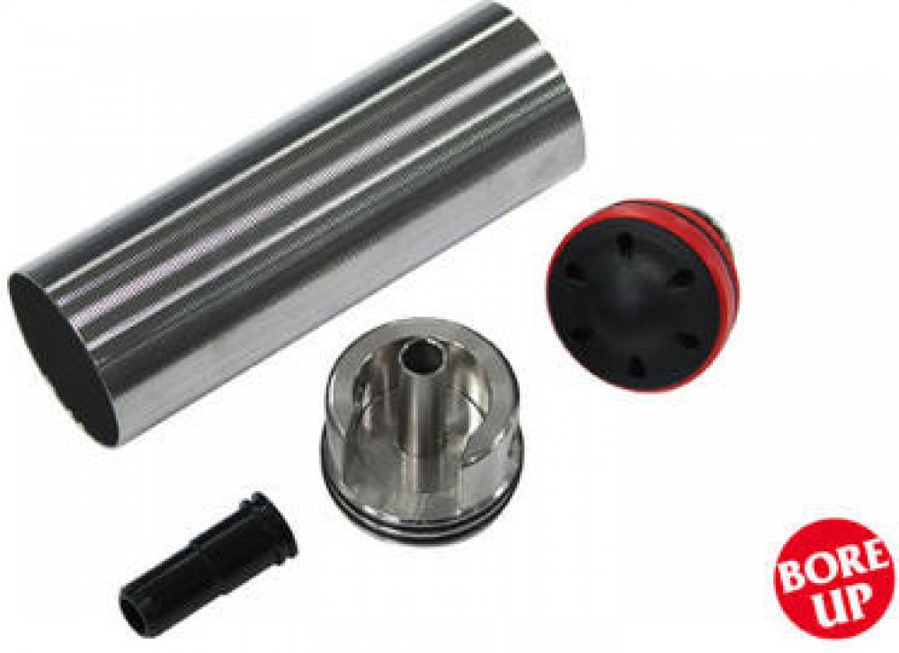 Tato vzduchotechnika je určena pro pružiny 120-170m/s, po jejím zamontování získáte o 20-30 FPS vyšší úsťovou rychlost.Balení obsahuje:- Bore-Up hlava válce s dvěma těsnícími okroužky (nerez)- Bore-Up vzduchotěsná tryska- Bore-Up hlava pístu (Gumový materiál na horní části pístu napomáhá sníženámu hluku při střelbě v porovnání se standartními díly. Navíc hlava pístu s ložiskem napomáhá práci pružině, lepší otáčení kolem osy)- Bore-Up chromový válecPozor:Jestliže se rozhodnete pro vlastní montáž jakýhkoliv mechanických částí Gearboxu např.: ozubená kola, sestavy ozubených kol,písty, hlavy pístu, pružiny, trny, kostry GB, ložiska.... Nebereme zodpovědnost za takovouto montáž, proto ztrácíte záruku na tuto část.Záruku je možno uplatnit tehdy když daná část byla namontovaná naším servisem. Připomínám, žepokud je zbraňzakoupenav našem obchodě, je servis/výměna bezplatná!Montáž tohoto dílu je zdarma při současném zakoupení nové zbraně, jinak je zpoplatněna (viz ceník upgradů)