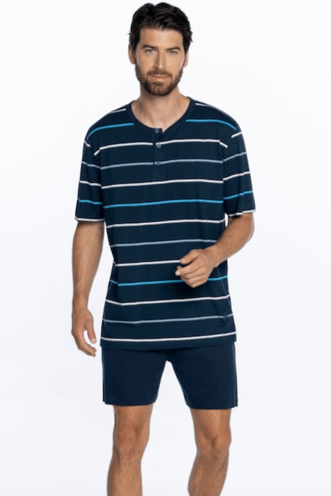 Pánské pyžamo AMADEO je ideální volbou pro muže, kteří hledají spojení pohodlí, stylu a kvality. Toto pyžamo má krátký rukáv a kraťasy v elegantní tmavě modré barvě, doplněné vrchním dílem ozdobeným decentními proužky. U výstřihu najdete zapínání na malé knoflíčky.