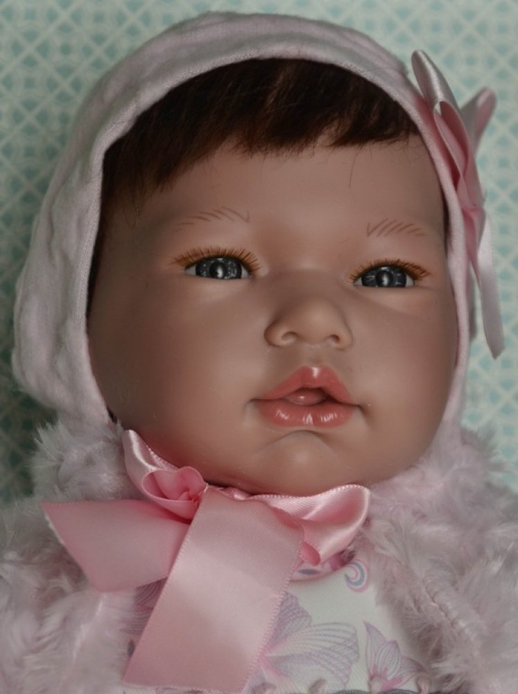 Reborn miminko holčička Valentina je 46 cm dlouhá, váží 1,750 kg. Má látkové tělíčko, končetiny a hlavičku z měkčeného vinylu, má krátké hnědé vlásky, jako skutečné miminko. Očička má akrylová.