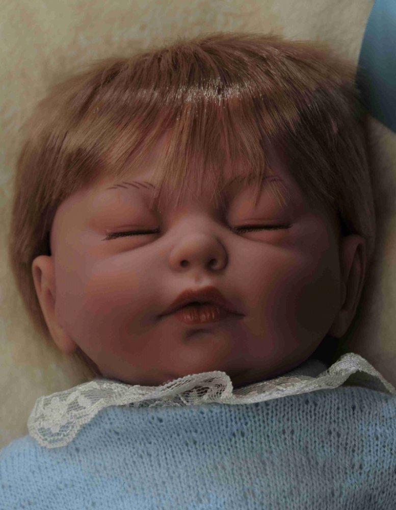 Reborn miminko chlapeček Marcos je 46 cm dlouhý, váží 1,750 kg. Má látkové tělíčko, končetiny a hlavičku z měkčeného vinylu, má krátké blonďaté vlásky. Očička má zavřená. Je oblečený do pletené světle modré soupravičky, svetříku s dlouhým rukávem a krajkovým límcem a krátkých kalhotek, na nohou má ponožky. Leží na měkkém polštářku.