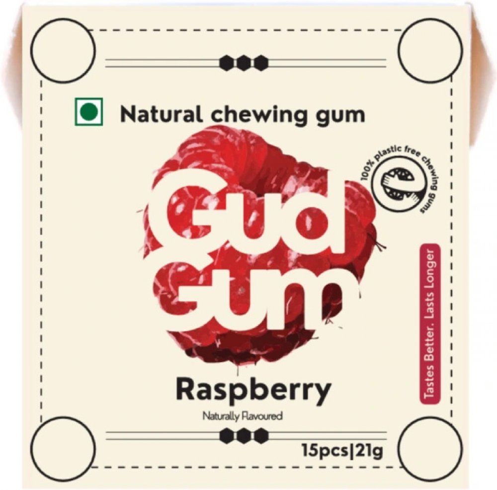 Malinové přírodní žvýkačky s přírodním gumovým základem (chicle) bez plastových materiálů (bez plastu), bez aspartamu, bez cukru, bez jakýchkoliv dalších umělých sladidel nebo umělých konzervantů, bez lepku, vegan.