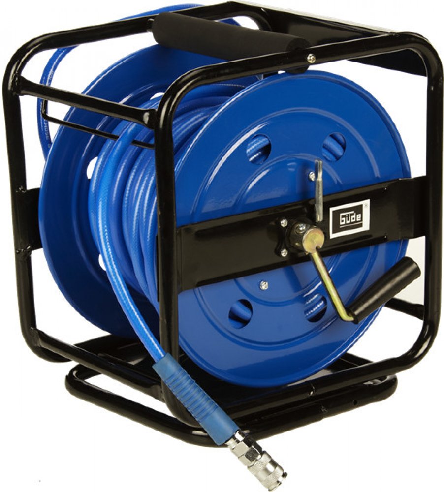 Přenosný hadicový naviják, určený pro použití v podmínkách servisních dílen, montážních provozů apod. Polyuretanová tlaková hadice s textilní vložkou (→ délka: 30 m, včetně rychlospojky/vsuvky integrované do bubnu/otočných kloubů na přípojkách), manuální navíjení hadice (→ sklopná klika s aretací).