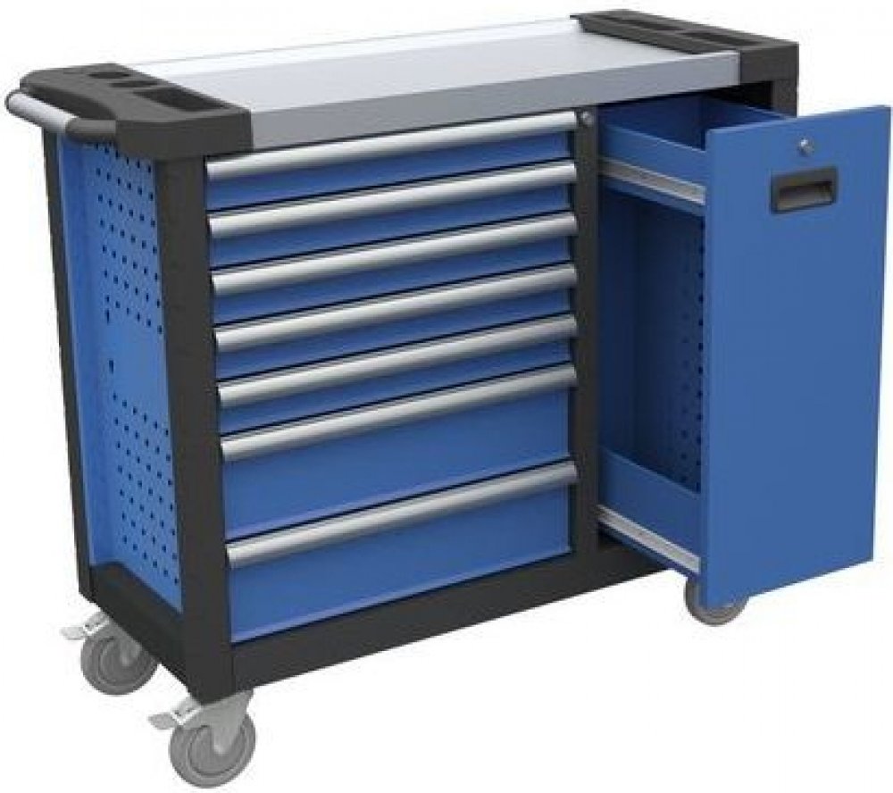 Vrchní (nerezová) odkládací plocha se zvýšenými okraji (přihrádkami) • děrované boční stěny pro upevnění závěsných držáků (Q-systém; otvory 1 cm2) • svislé hrany vozíku vč. ochranných lišt proti náhodnému poškození např. karoserie servisovaného vozidla • transportní rukojeť • celogumová pojezdová kola (průměr: 150 mm, dvě vodicí s brzdou).