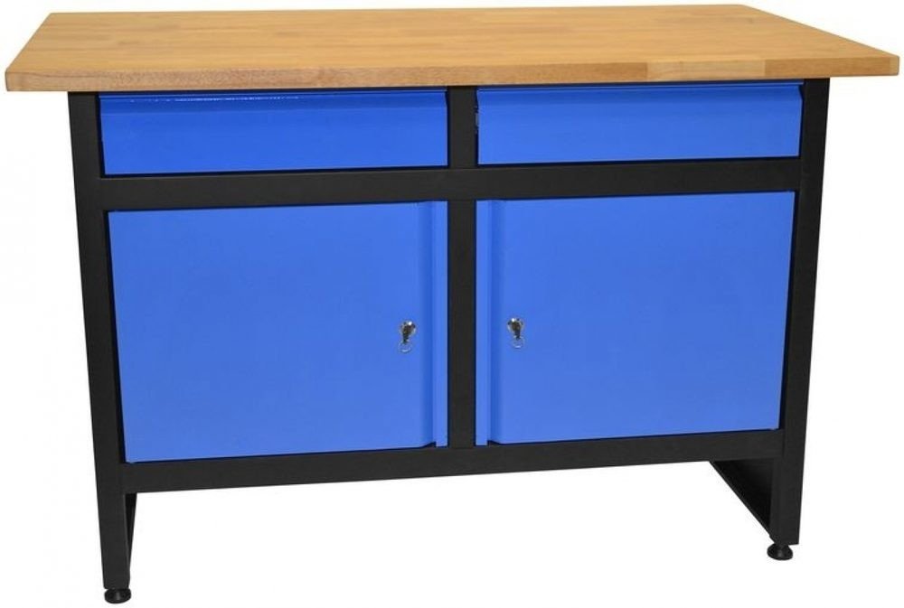 Pracovní deska 1200 x 600 mm, max. zatížení 300 kg, 2 zásuvky, 2 uzamykatelné dveřové skřínky, hmotnost 44 kg. Dílenský stůl GÜDE GW 2/2 40472 Pracovní stůl, určený k použití v domácích nebo údržbářských dílnách, montážních provozech apod. Pracovní deska (d x š x v): 1.200 x 600 x 30 mm; spárovka z kaučukovníkového dřeva, z legální těžby v ekologicky obhospodařovaných lesích, se sraženými hranami, povrchová úprava roztokem lněné fermeže s přísadami. Celkové rozměry 1200 x 600 x 850 mm. Vybavení: 2…