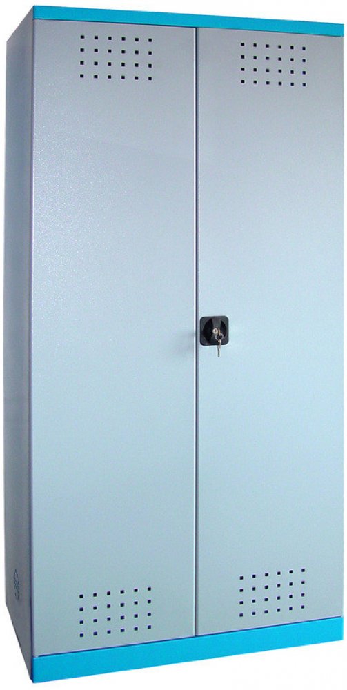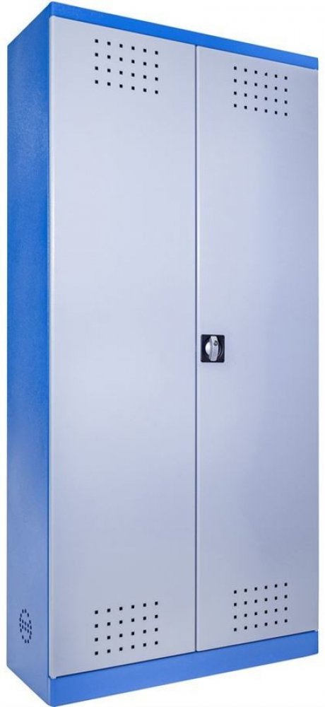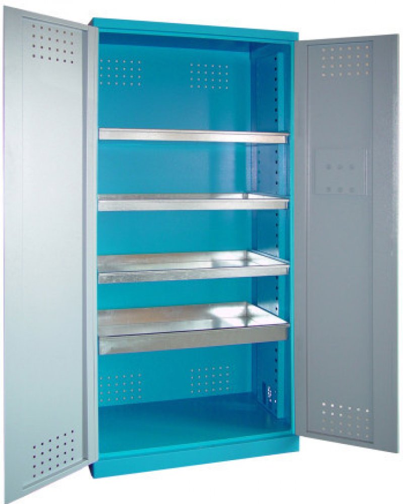 Vybavení: dvoudveřová skříň (→ uzamykání cylindrickým/rozvorovým zámkem - dvojité uzamčení, 2 klíče); 4 výsuvné vany z pozinkovaného plechu (→ volitelné nastavení výšky, nosnost: 30 kg); systém odvětrávání skříně (→ děrovaný korpus/dveře).