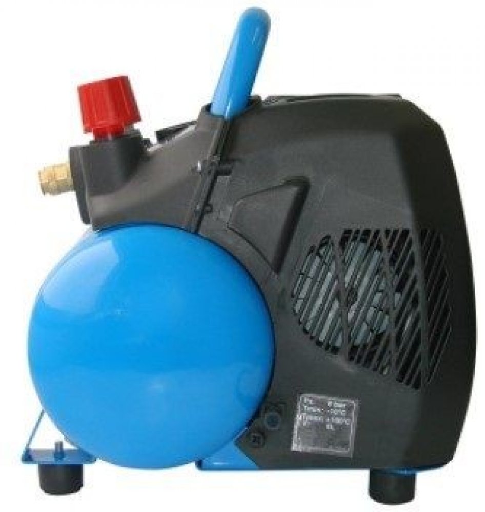 Přenosný bezolejový kompresor, vhodný např. pro servisní práce (vyfukování nečistot z počítačů /elektrických vedení apod.) nebo domácí použití (plnění míčů/pneumatik, sponkování, nástřik airbrush atd.).