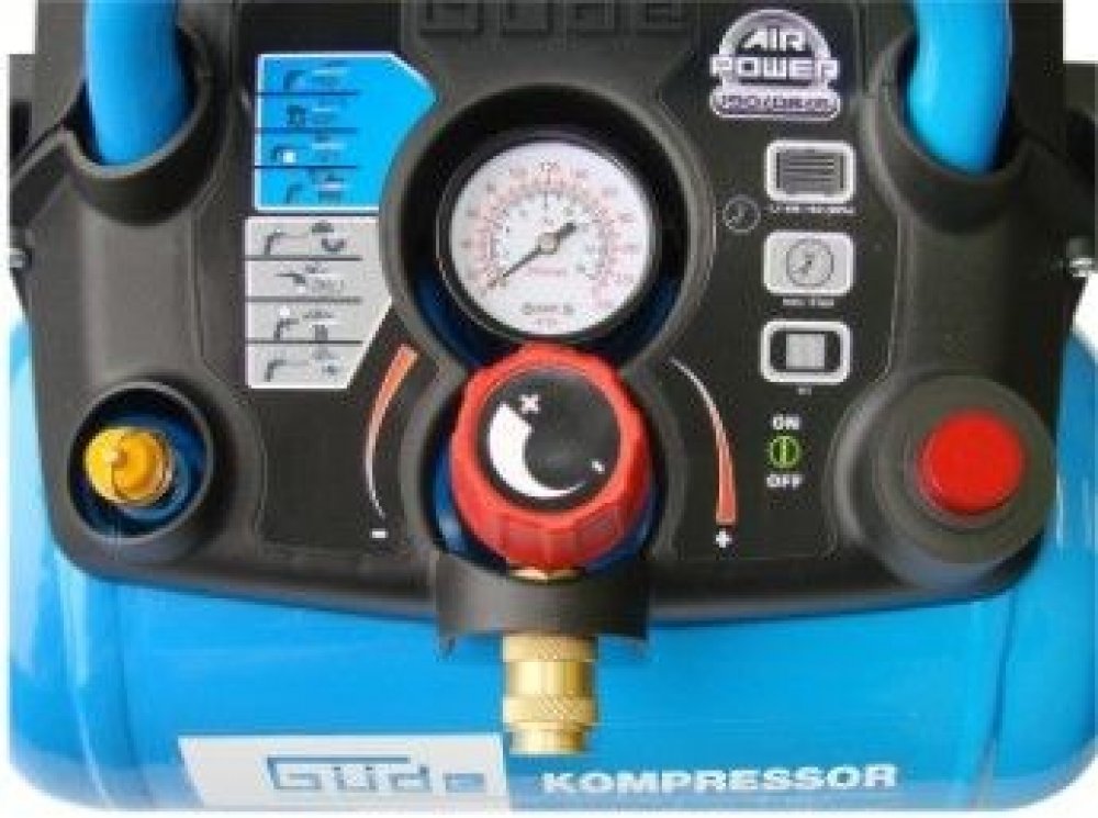 - vybavení: manometr, výstup tlakového vzduchu (kovová rychlospojka), tlakový spínač, pojistný přetlakový ventil, odkládací přihrádka, transportní madlo
