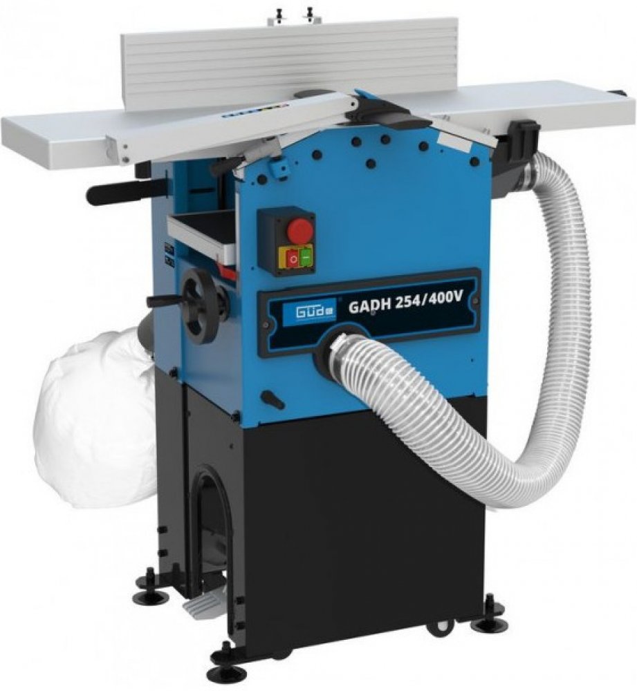 Konstrukce: hliníkový srovnávací stůl (→ d x š: 1.050 x 260 mm), nerezový protahovací stůl (→ d x š: 480 x 254 mm), profesionální nožová hřídel s HSS řeznými noži (2), ochranný kryt nožové hřídele, uzavřený skříňový podstavec s otvory (4) pro montáž napevno.