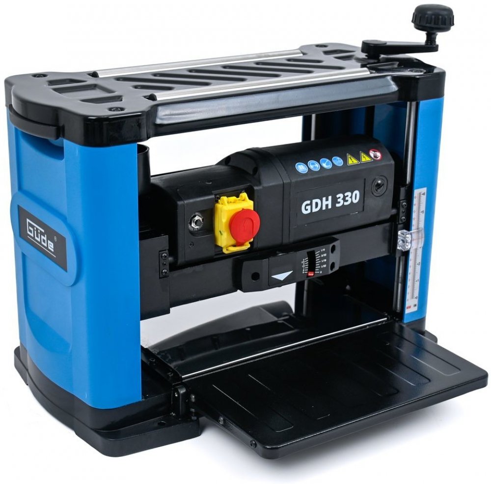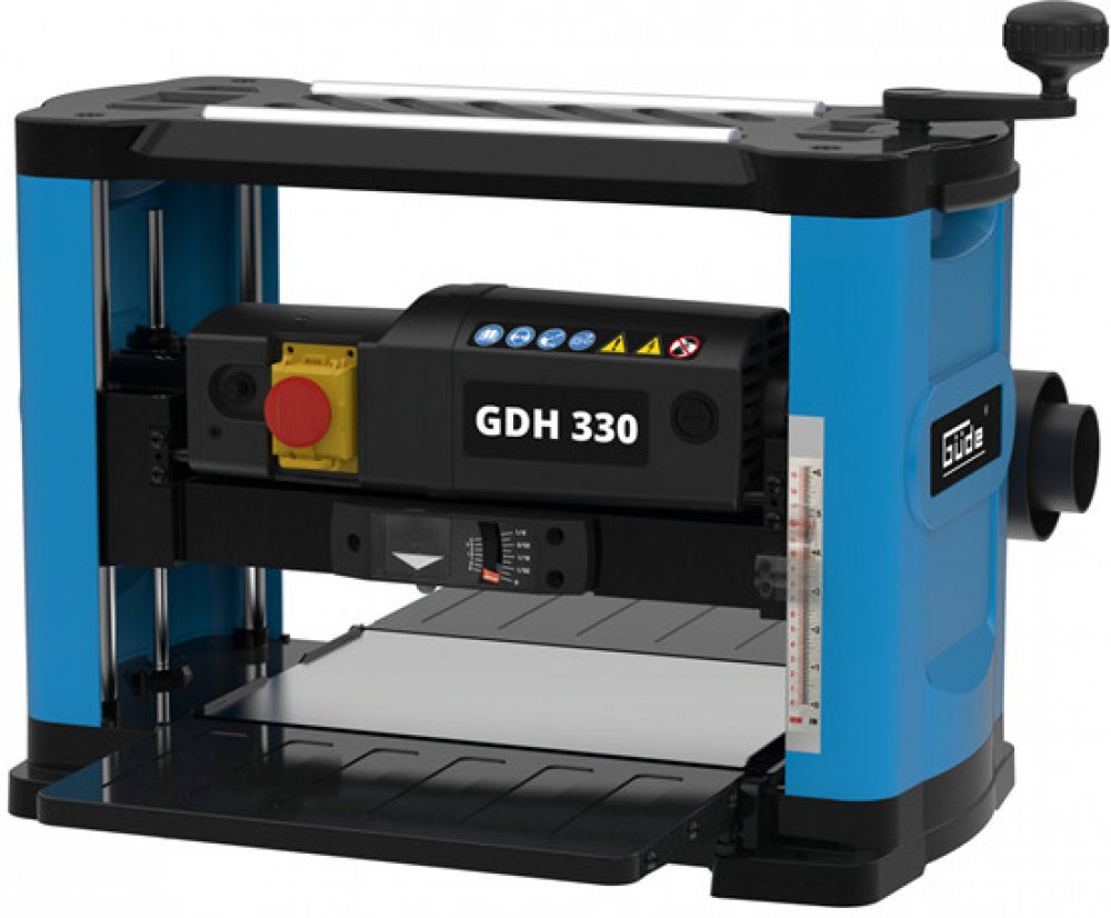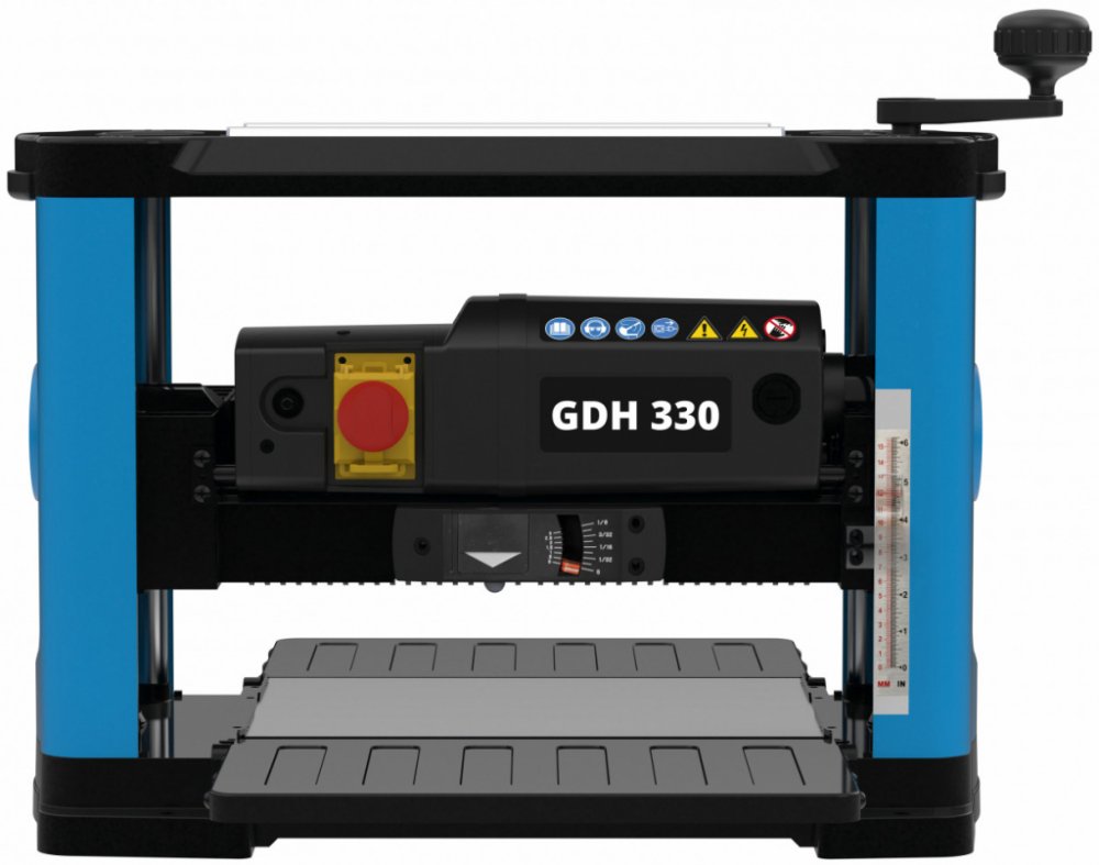 Jemné seřízení hloubky řezu pomocí otočné kliky a ukazatelů (2), automatický posuv obrobku po válcích.