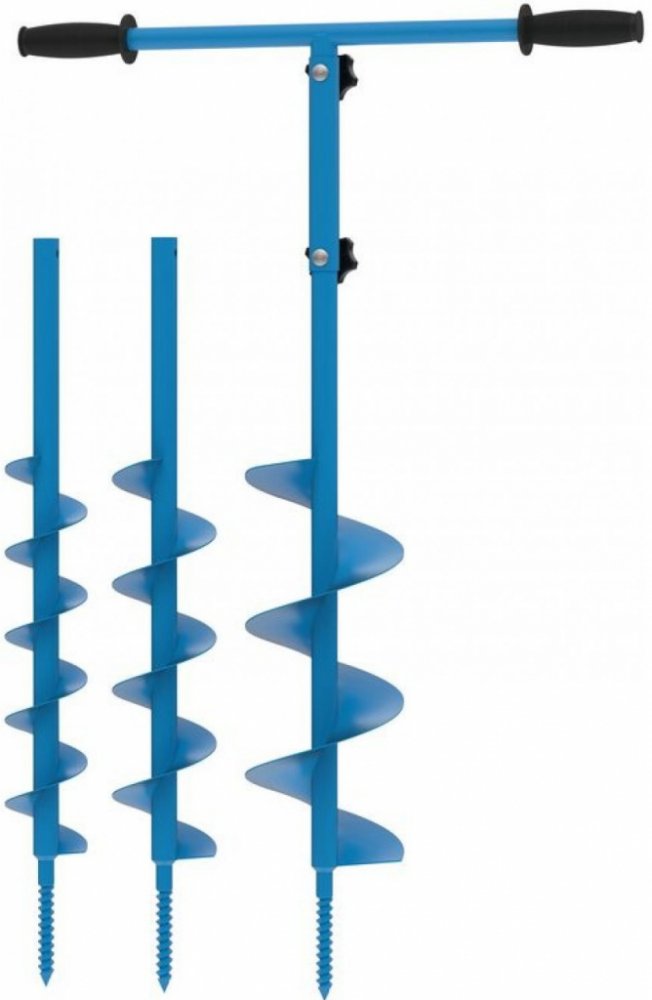 Ruční zemní vrták s různými nástavci. Vhodný na osazování plotových sloupků, sázení stromů, keřů a podobně. Křížová kovová rukojeť. S vrtáky 80 mm, 100 mm a 150 mm. Celková výška 1030 mm.