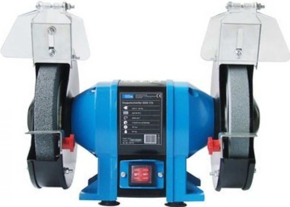 Konstrukce: vylehčená kovová skříň, nastavitelné opěrky obrobku, ochranné kryty proti jiskrám, robustní podstavec (vč. otvorů pro montáž na pracovní desku).