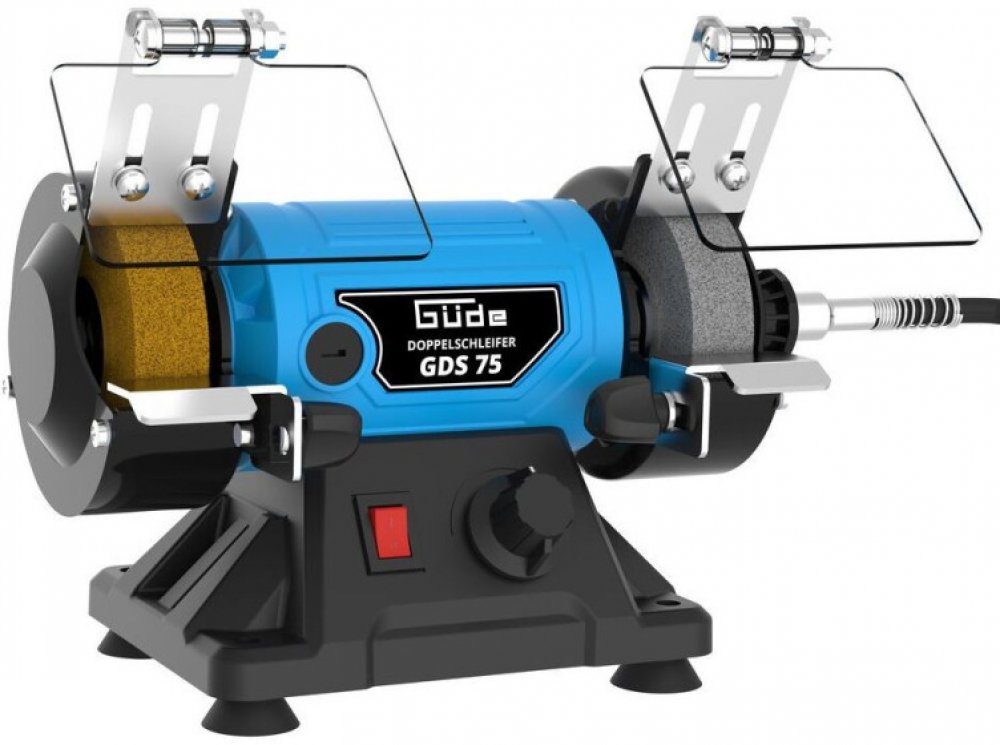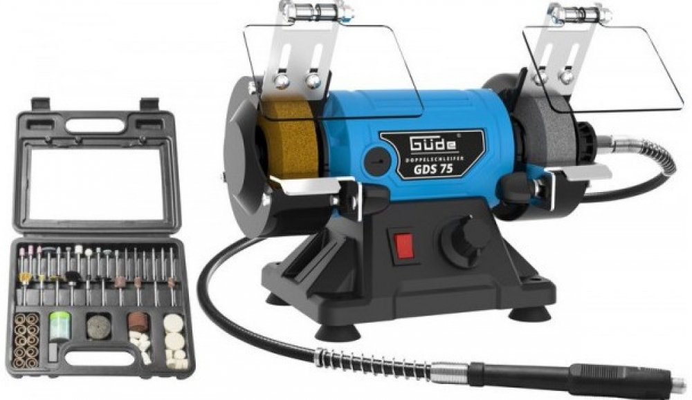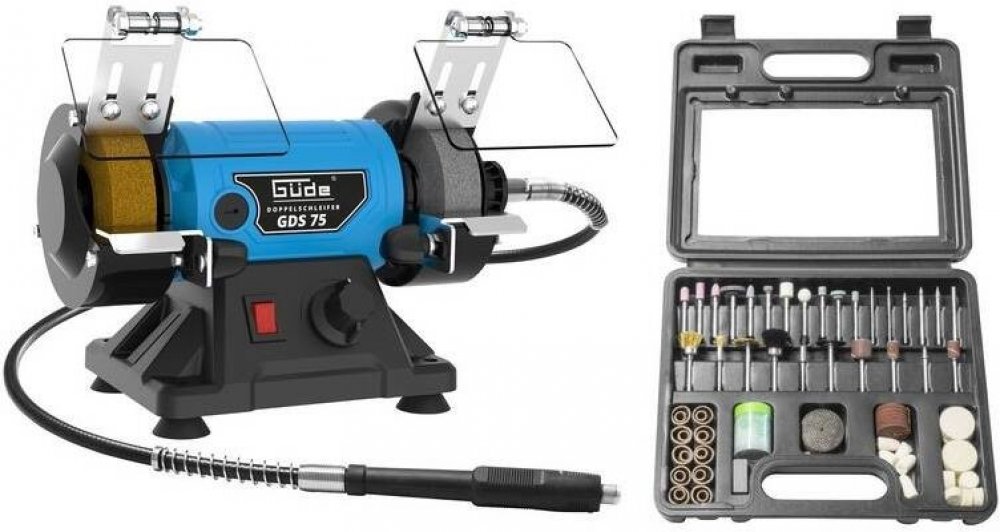 Kombinovaná stolní bruska GÜDE, vhodná k ostření drobných nástrojů nebo cizelování obrobků pomocí brusných, lešticích aj. tělísek.