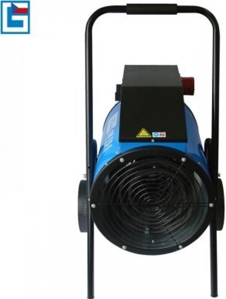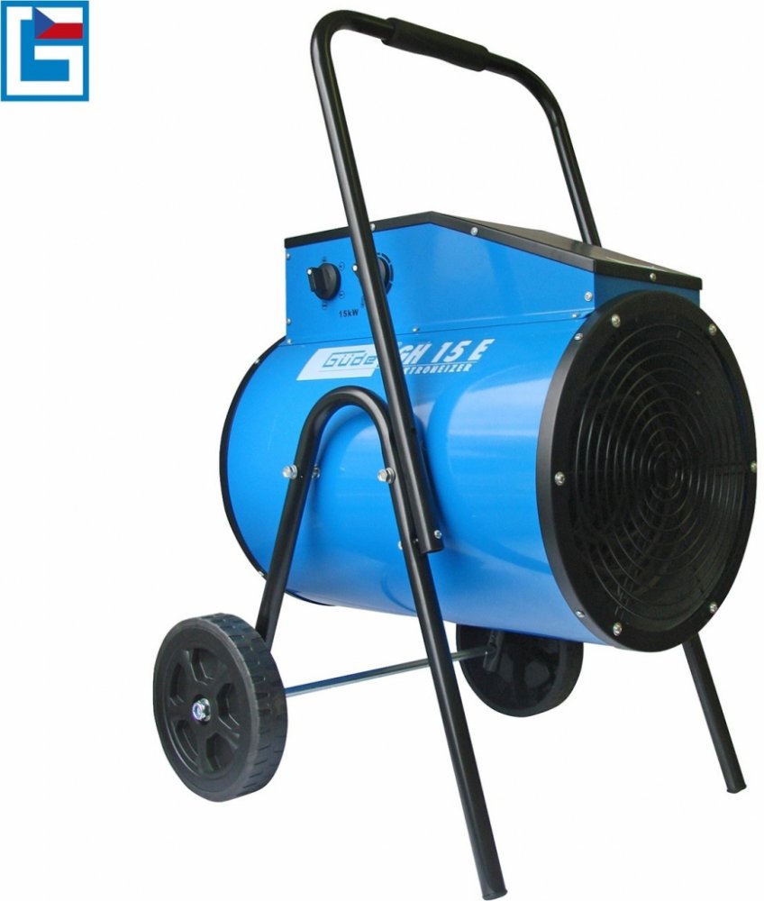 Max. topný výkon: 15 kW (→ 12.900 kcal/hod., 3 topné stupně: 7,5 kW/10 kW/15 kW), prostorový termostat (→ automatické zapínání/vypínání topné spirály po dosažení nastavené teploty), ventilátor.