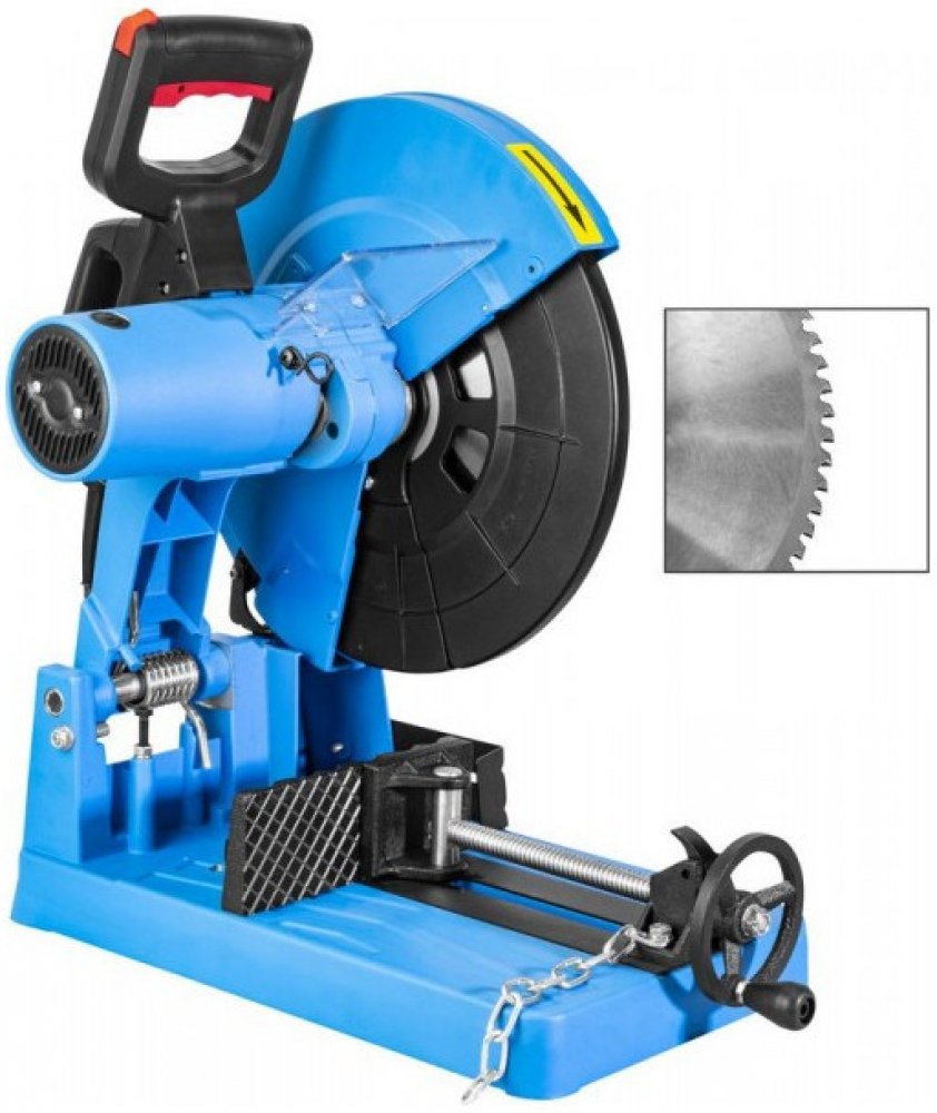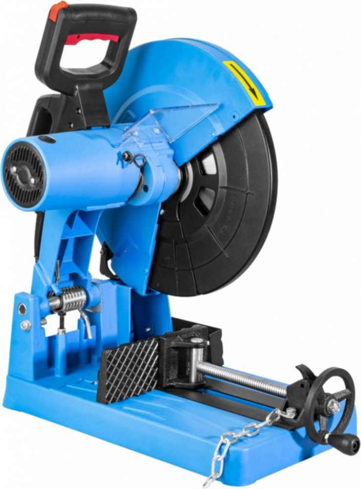 Konstrukce: pilový kotouč 355 x 25,4 x 2,3 mm (SK), ochranný (kyvný) kryt kotouče, robustní ocelový podstavec (vč. integrované nádobky na prach), držadlo pro pohodlné přenášení.