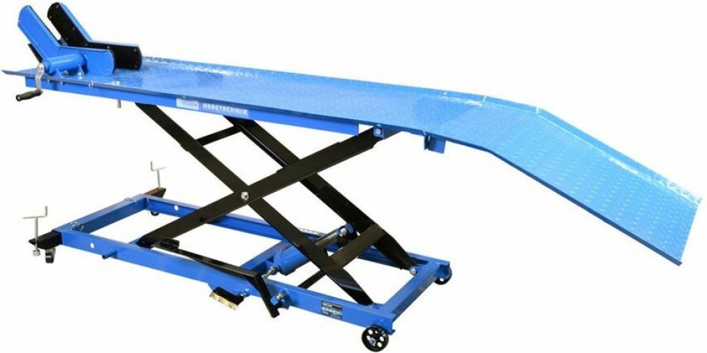 Hydraulická zvedací plošina, určená ke zdvihání motocyklů v prostředí garáží, domácích/servisních dílen apod. (-> maximální nosnost: 560 kg).