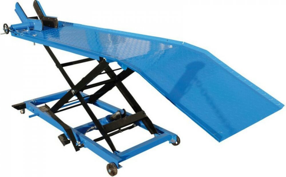 Zvedací plošina na motorky do 560 kg. Celoocelová konstrukce, 2 otočná a 2 pevná kolečka, podstavec ze čtyřhranu, plošina z ocelového rýhovaného plechu, pohodlné zvedání a spouštění pomocí nožního pedálu. Upevňovací čelisti na přední kolo do 180 mm, upevnění prostřednictvím ruční kliky.