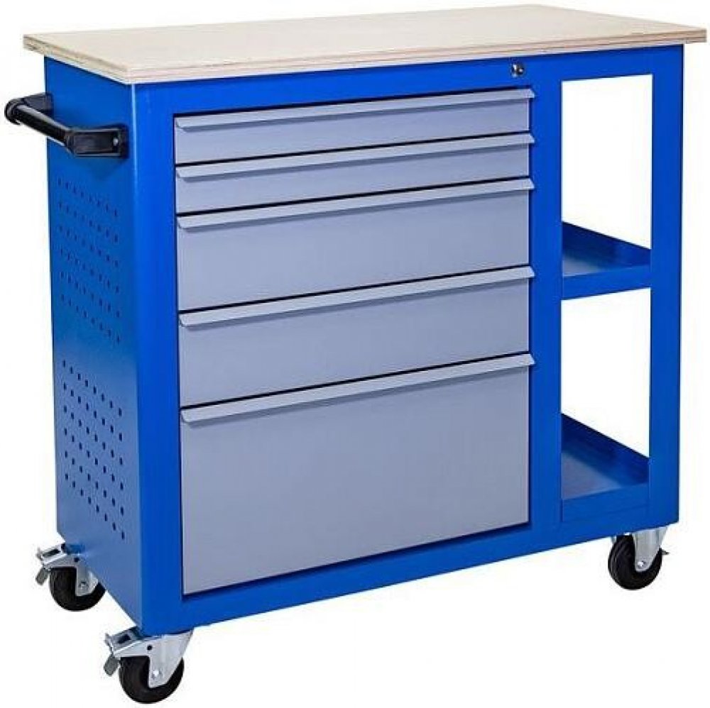 Vybavení: 5 zásuvek (→ 2 x výška 55 mm/2 x výška 125 mm/1 x výška 270 mm, centrální uzamykání cylindrickým zámkem, 2 klíče); děrované stěny pro upevnění závěsných držáků nářadí (→ otvory 10 mm2); boční odkládací plocha s poličkou (→ rozměry d x š x v: 447 x 240 x 765 mm); 4 celogumová kolečka (→ průměr: 100 mm, 2 pevná/2 vodicí/1 brzda); transportní madlo