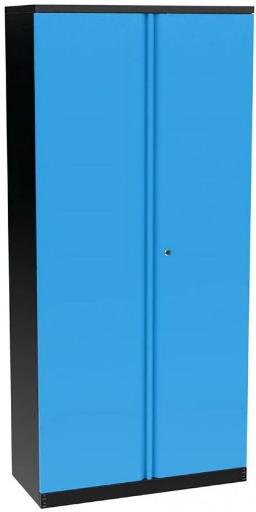 Skříň na nářadí, určená k využití v domácích nebo údržbářských dílnách, montážních provozech apod.Dvoudveřová celokovová skříň (-> uzamykatelná cylindrickým zámkem; 2 klíče). Vybavení: 4 ukládací police (-> rozměry d x š: 850 x 360 mm; max. nosnost: 30 kg; s volitelným nastavením výšky).Konstrukce: korpus z ocelového plechu, zapuštěná madla (2), barevné provedení: RAL 9005 (rám, police), RAL 5015 (dveře). Dodáváno v rozloženém stavu.