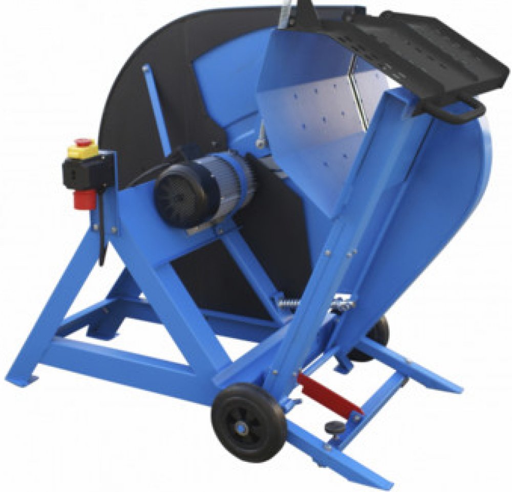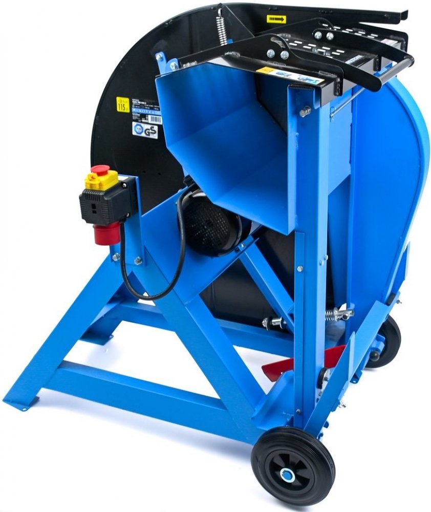 Konstrukce: svařovaný ocelový rám, 4dílný kryt pilového kotouče, podavač s vrchním ochranným krytem a hroty proti protáčení řezaného materiálu, transportní kola.