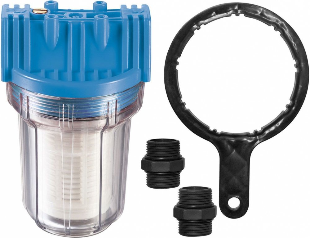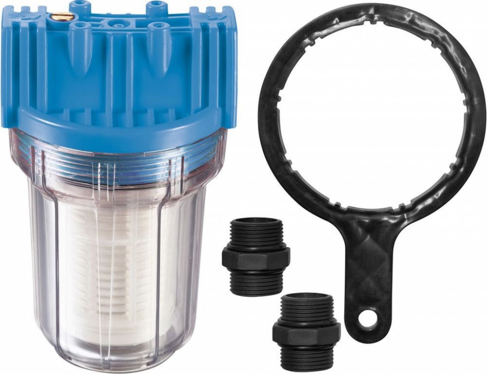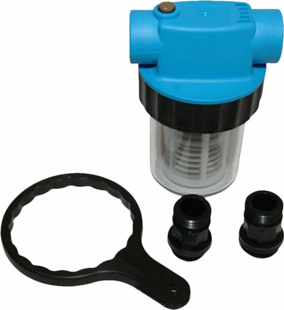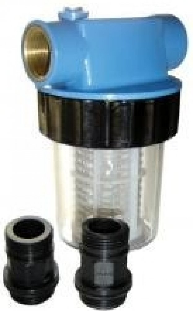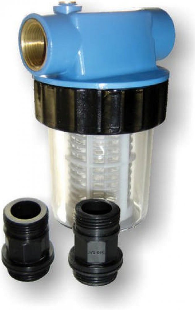 Filtr se montuje mezi sací hadici a čerpadlo. Tak se zabrání nasávání písku a pevných látek a tím i možnému poškození těsnění čerpadla. Filtr má vymývateľné filtrové kartuše a oboustrannou závitovou přípojku. PVC průhledné nádoby filtru se dají snadno odšroubovat.