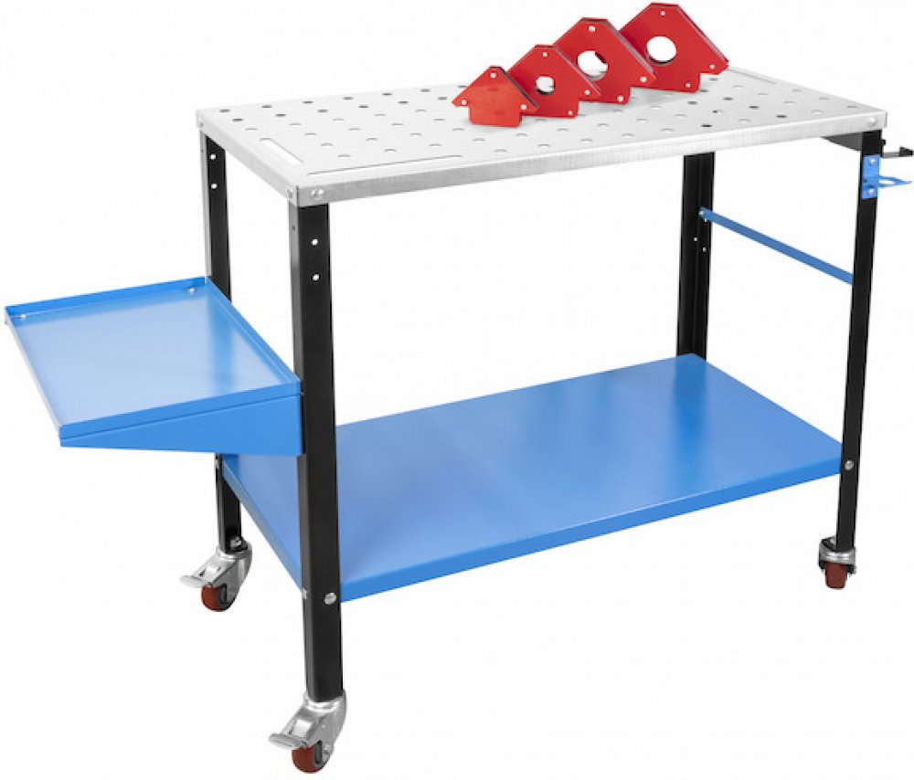 Pojízdný svařovací stůl, určený pro (ruční) obloukové svařování v údržbářských, řemeslnických i servisních dílnách. Deska stolu s otvory k zajištění svařence pomocí přípravků