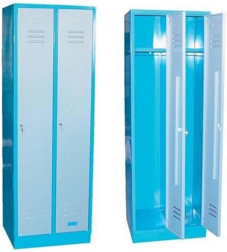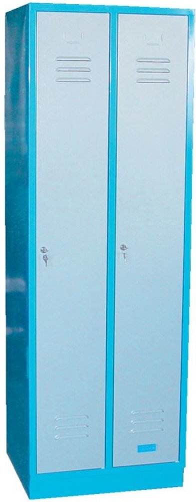 Dvoukomorová šatní skříň s univerzálním využitím ve výrobní i nevýrobní sféře (→ školní šatny, sportovní kluby, servisní dílny, výrobní provozy apod.)