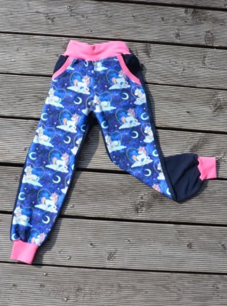 Bavlněné tepláky značky GUDO - přední strana s motivem jednorožců, zadní strana tmavě modrá (navy) s náplety okolo pasu a na nohavicích - jsou velmi pohodné a příjemné na nošení.