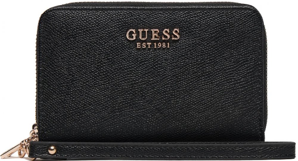 Černá praktická dámská peněženka značky GUESS. Stylový hladký design s kovovým logem značky Guess na přední straně. Celkové zapínání peněženky na dvojí zip. Vnitřní uspořádání nabízí přihrádky na karty, prostor na bankovky a kapsu na mince se zapínáním na zip. Elegantní a praktický doplněk pro každý den.
