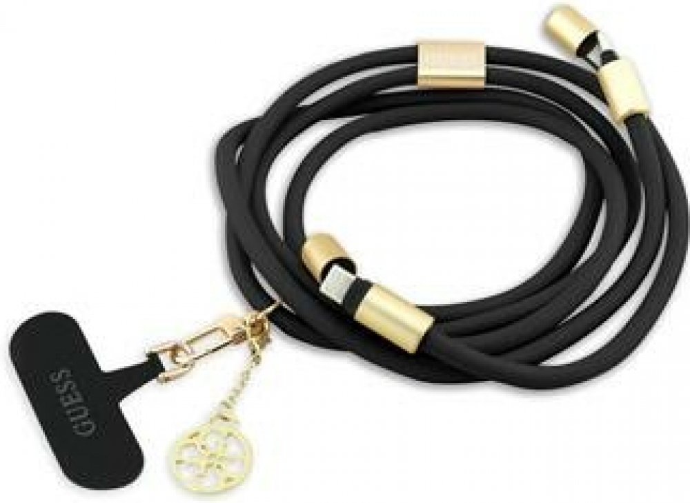 Stylový popruh Guess Crossbody 4G Charm s nabíjecím kabelem USB-C/USB-C ukrytým v koncích popruhu. Popruh je univerzální pomocník k většině mobilních telefonů se zadním krytem. Elegantní doplněk k vašemu outfitu s Guess potiskem a přívěskem s logem Guess. Lehce jej naistalujete díky speciální vložce s háčkem, stačí vložit pod kryt a je to. Popruh lze nosit připnutý na kabelce, na rameni, jako kabelku, uvázaný kolem zápěstí, kolem krku, zavázaný na poutko opasku. Nastavitelná délka je 150 cm.