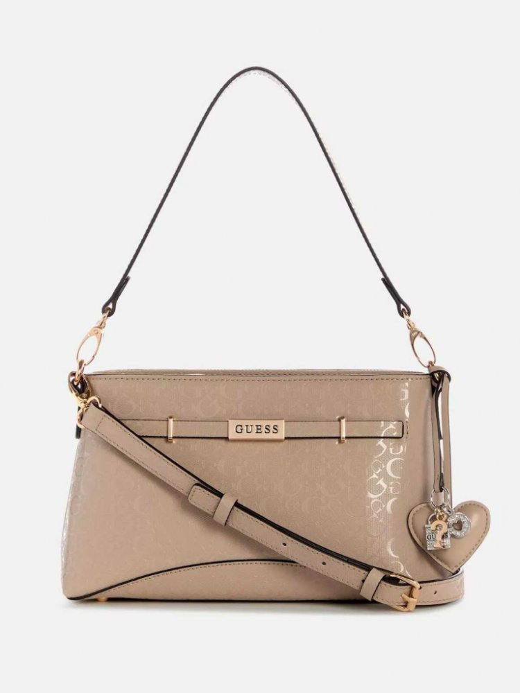 Elegantní satchel kabelka s celoplošným vzorem loga G-Shine, která zaujme moderním a luxusním vzhledem. Lesklé kovové doplňky ve světle zlatém odstínu a logo na přední straně dodávají kabelce exkluzivní styl. Prakticky řešený, podšitý interiér nabízí dostatek prostoru pro každodenní nezbytnosti. Kabelka se uzavírá na zip a je vybavena horními uchy s odnímatelnými ozdobnými přívěsky. Díky nastavitelnému a odnímatelnému crossbody popruhu ji lze nosit několika způsoby.
