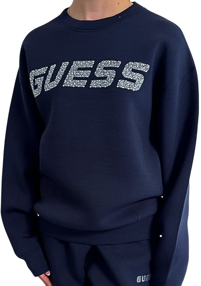 Mikina je vpředu zdobena jemnými kamínky s nápisem značky Guess.